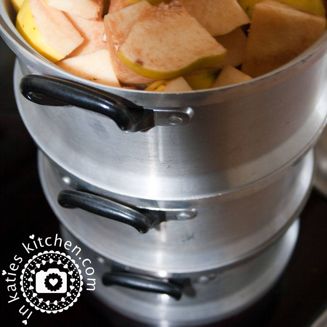 2,5 kg Quitten, in Stücke geschnitten zuerst einmal mit Dampf entsaften.
