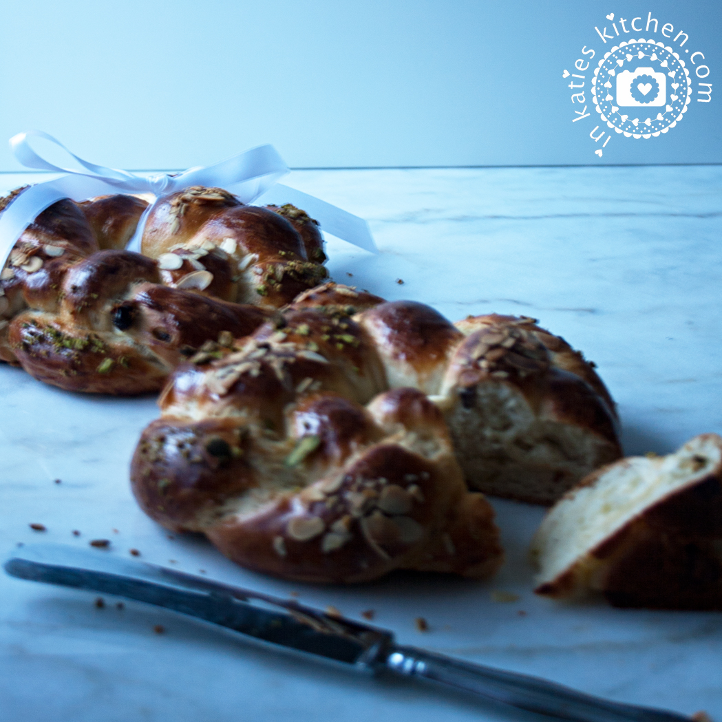 Das Mehl mit dem Zucker, Salz und der Hefe in eine ausreichend große Schüssel geben. Die Milch mit Butter und Vanille in einem Topf erwärmen. Nicht zu heiß werden lassen, nur so warm, dass die Butter langsam schmilzt. Die Milch zu den übrigen Zutaten gießen und alles miteinander verkneten. Die Schüssel mit einem Küchentuch abdecken und an einem warmen Ort zwei Stunden gehen lassen. Wenn der Teig sich ungefähr verdoppelt hat nochmals gut durchkneten und in sechs etwa gleich große Stücke teilen. Für den natürlichen Strang zwei von den Teigstücken zu Rollen formen (ca. 50 cm lang). In zwei weitere Stücke ein paar Rosinen hinein kneten und ebenfalls zu Rollen formen. Für die letzten beiden Stränge werden zuerst