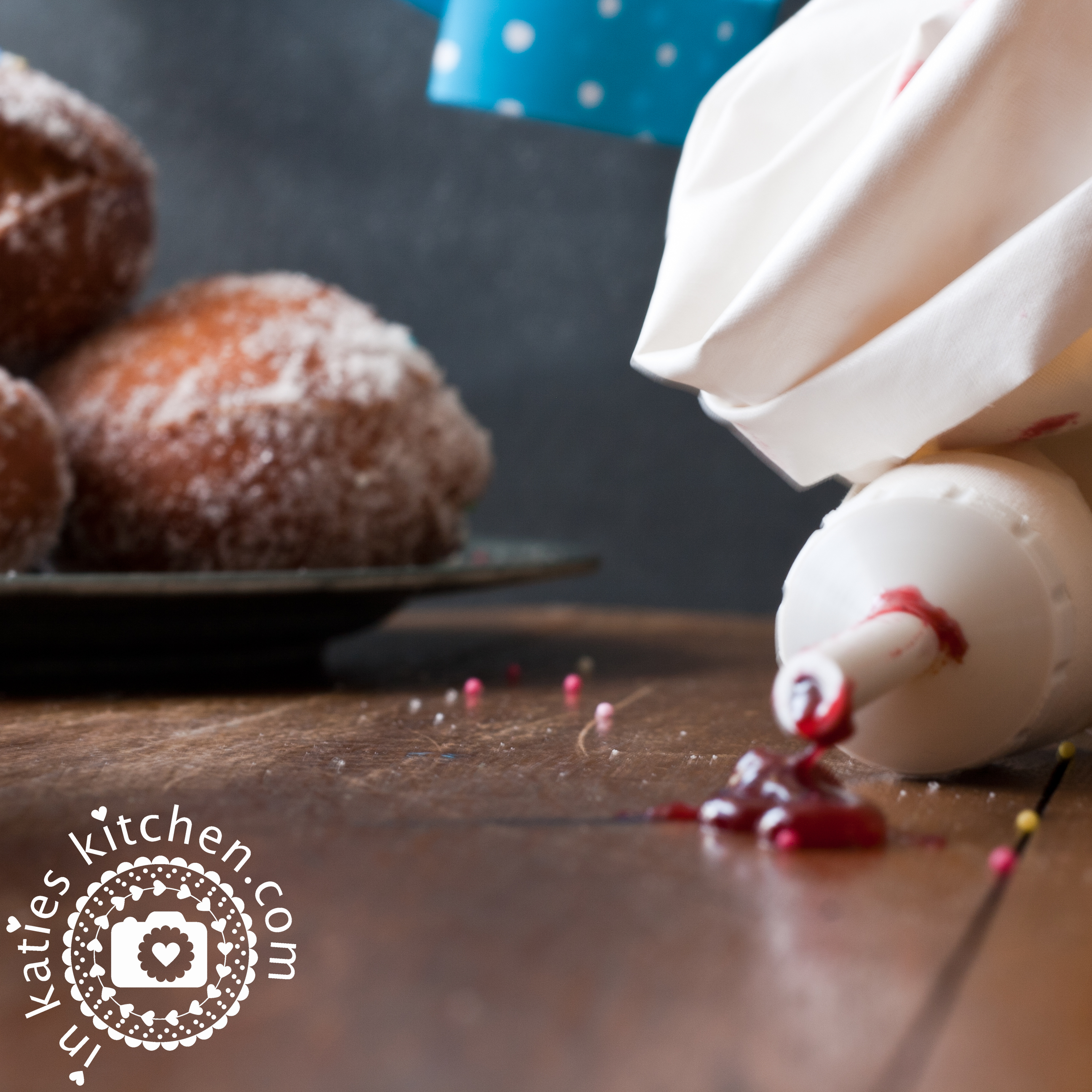 In der Zwischenzeit 2 Liter Öl zum Frittieren erhitzen. Wenn es heiß genug ist die Teiglinge im Öl von beiden Seiten ausbacken. Anschließend kurz auf Küchenpapier abtropfen lassen und mit Marmelade füllen. Abschließend in Zucker wälzen oder mit Puderzucker bestäuben. HELAU!