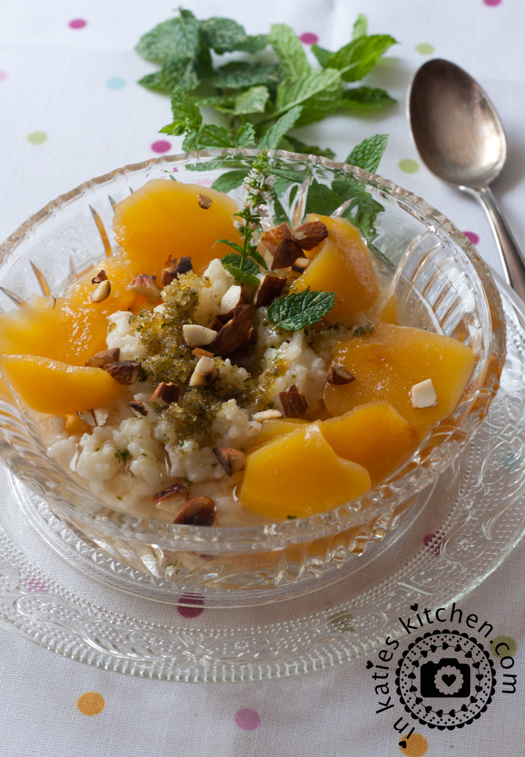 Vor ein paar Tagen wurde ich mit einer großen Tüte Pfirsiche beglückt. Bei der Vielzahl von Möglichkeiten in der Verwertung hatte ich die Qual der Wahl…was machen mit den pelzigen Gesellen? Nach kurzer Überlegung beschloss ich: diesmal keine Marmelade! Inspiriert vom Lieblingsessen meiner Tochter – Milchreis mit Zucker & Zimt und Pfirsichkompott serviere ich Euch heute: Milchreis mit Mandelmilch und Minze-Vanille-Pfirsiche. Beginnen wir mit dem Obst…