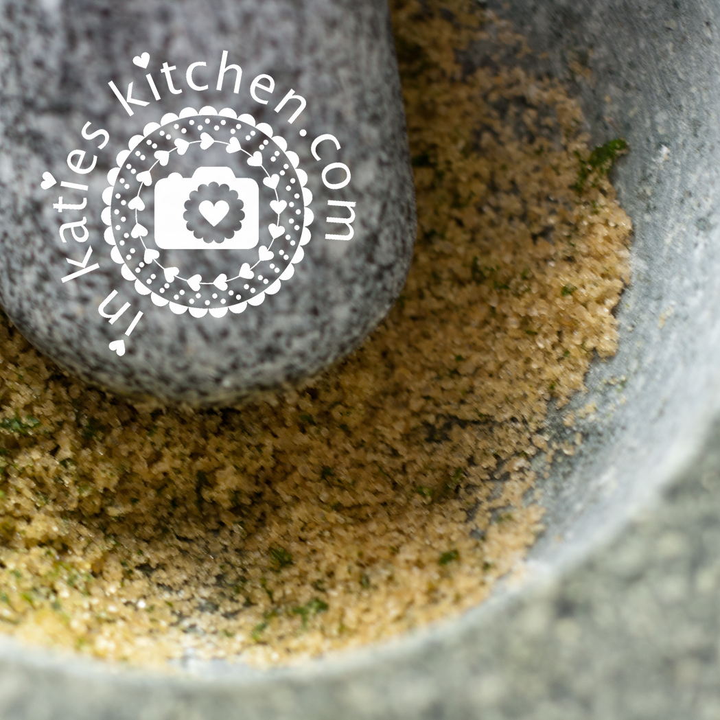 1 Esslöffel brauner Rohrzucker mit ein paar klein geschnittenen Minzblättchen im Mörser zerreiben.