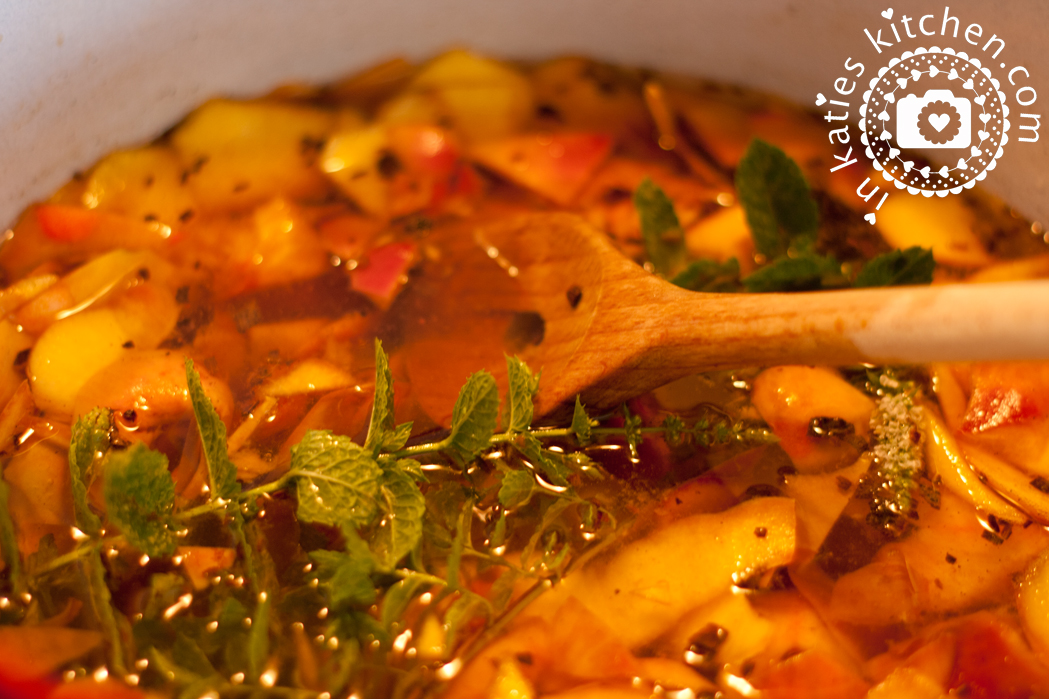 Was die Mengenangaben angeht, so habe ich die Pfirsiche nicht gewogen. Ich habe einfach alle Pfirsiche die ich hatte (eine große Tüte voll) kreuzweise eingeschnitten, überbrüht, kaltabgeschreckt und die Haut abgelöst oder geschält. Je nach Reifegrad der Früchte löst sich die Haut leichter oder eben gar nicht. Das Gleiche gilt für die Kerne. Wenn die Pfirsiche sich nicht vom Kern lösen ließen habe ich einfach das Fruchtfleisch in großen Stücken abgeschnitten. Schalen und unversehrte Kerne wandern in einen großen Kochtopf. Die Pfirsichstücke mit Zitronensaft beträufeln, damit sie nicht braun werden. Ich habe 2 Liter Wasser und 600 g Einmachraffinade zu den Schalen und Kernen gegeben und alles mit 5 Zweigen Minze und einer Vanillestange (Mark und Schote) aufgekocht.