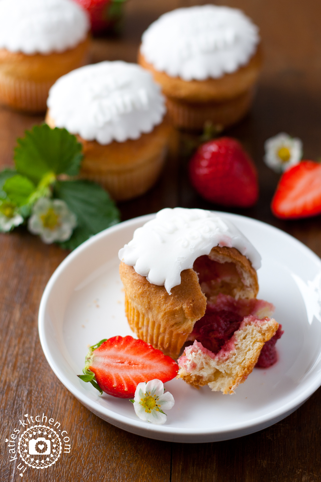 und einem Ei einen lockeren Teig zusammen mischen und diesen mit einem Tuch abgedeckt über Nacht einfach in der Küche stehen lassen. Am nächsten Morgen den Teig nochmals gut durchkneten und eventuell noch etwas Mehl dazu geben. Er sollte nicht kleben. Nun den Teig in 12 gleich große Teile schneiden und in jede Teigkugel eine Erdbeere stecken. Die fertigen Erdbeerteiglinge in ein mit Papierförmchen ausgelegtes Muffinblech legen, mit etwas Wasser bepinseln und abermals etwa eine halbe Stunde gehen lassen. Anschließend im vorgeheizten Backofen bei 175°C ca. 25 Minuten backen.