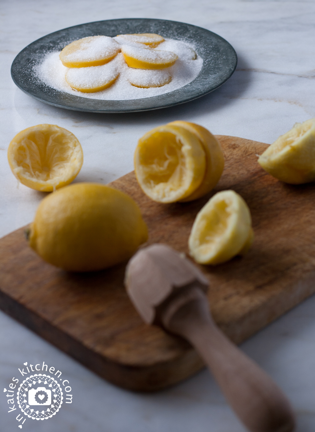 Hierfür einfach eine unbehandelte Zitrone in ca. 5 mm dicke Scheiben schneiden. In einem Topf 125 ml Wasser mit 125 g Zucker aufkochen. Die Zitronenscheiben hinzufügen und 10 Minuten köcheln lassen. Herd abstellen und alles einfach 2 Stunden stehen lassen. Anschließend die Zitronenscheiben gut abtropfen lassen und in Zucker wälzen. Was übrig bleibt ist ein leckerer Zitronensirup, der sich hervorragend für Getränke eignet. Hierfür den Sirup einfach noch einmal aufkochen und heiß in eine saubere kleine Flasche füllen.