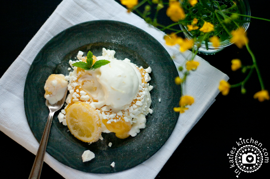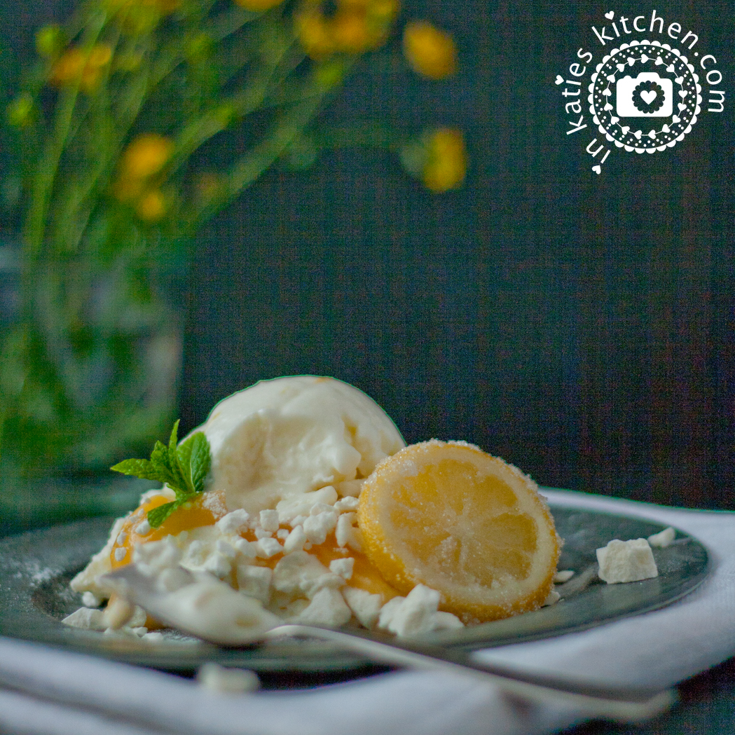 Um das Eis nun anzurichten nehmt Ihr einfach einen schönen Teller, gebt Schlagsahne in die Mitte, darauf das Lemon Curd, die Baiser-Krümel und eine schöne dicke Kugel Joghurt-Zitroneneis. Ein bisschen Minze und eine gezuckerte Zitronenscheibe dazu und so sieht das dann aus…