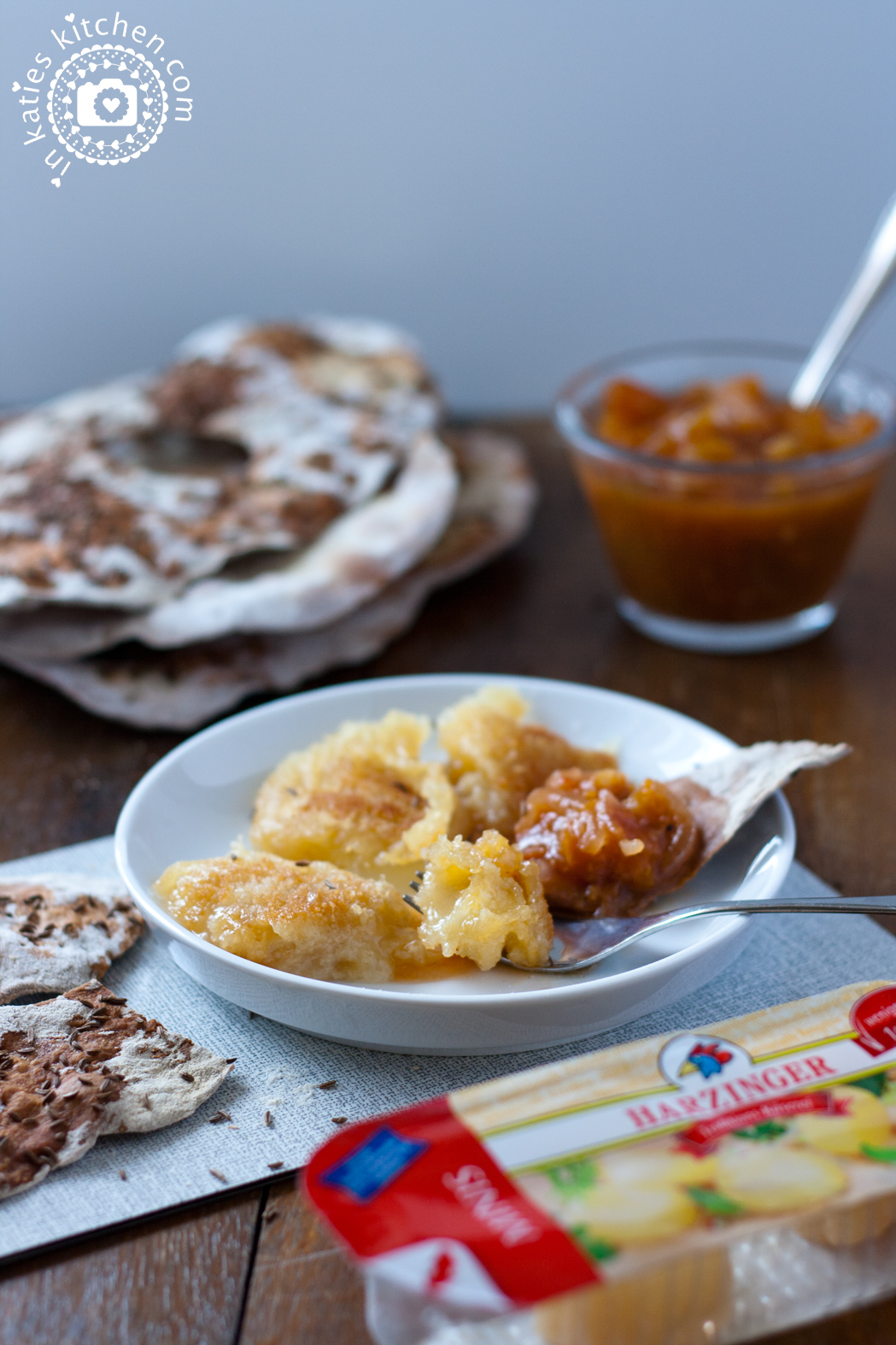 Gebackene HARZINGER-Minis mit Tomaten-Aprikosen-Chutney und Kümmelknäckebrot