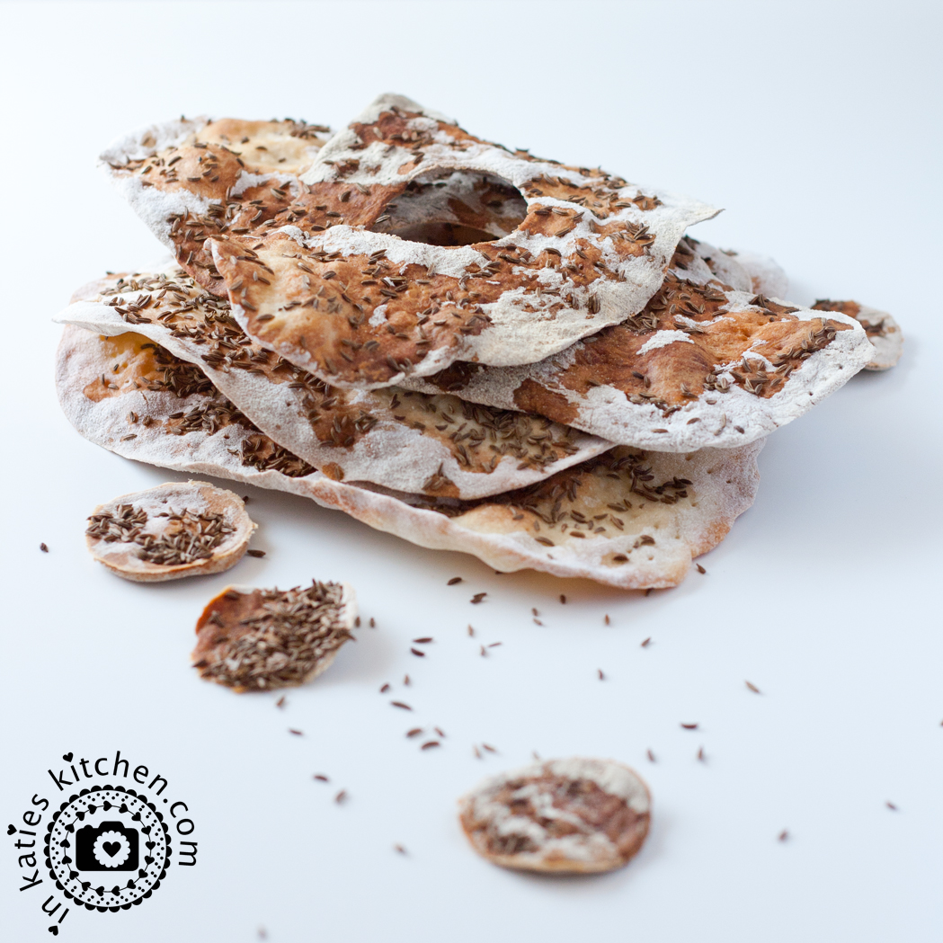 soviel warmes Wasser, dass eine Teigkugel entsteht, die nicht mehr klebt. Den Teig etwa 1/2 Stunde stehen lassen. Anschließend in 4 Stücke teilen und jedes Stück erst zu einer Kugel rollen, dann mit der Hand zu etwa 0,5 cm flachen Fladen auseinander drücken. In der Mitte einen Kreis ausstechen, die Fladen auf ein mit Backpapier ausgelegtes Backblech legen, mit Wasser bepinseln und mit ganzem Kümmel bestreuen. Das Knäckebrot bei 200°C im vorgeheizten Backofen ca. 20 Minuten Backen.