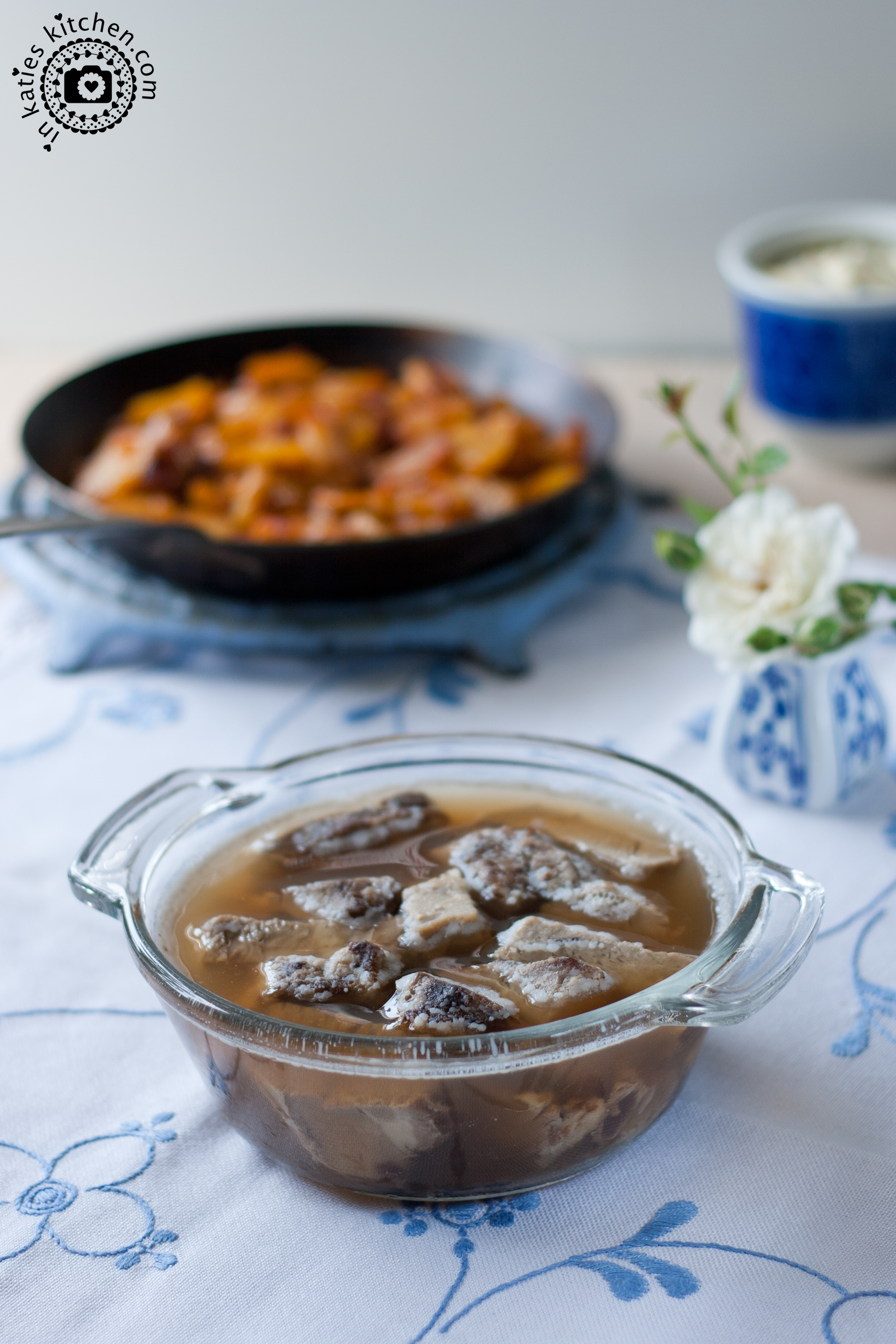 Jetzt ist es wieder soweit! Das Thermometer kratzt an der 35 Grad-Marke und das friesische Blut in meinen Adern bemerkt: ihm ist zu warm. Viiiieeeel zu warm, es will ans Meer. Natürlich nicht an irgendein Meer! Nein, die Nordseeküste ganz weit oben im Norden soll es sein. Nun ja, da das spontan nicht so einfach möglich ist, muss wenigstens Dithmarscher Sommerküche auf den Teller – möglichst erfrischend und kalt. „Gut gekühles Sauerfleisch, ein paar Tage im Kühlschrank durchgezogen, mit Bratkartoffeln – das wär’s jetzt!“ Gesagt – getan!