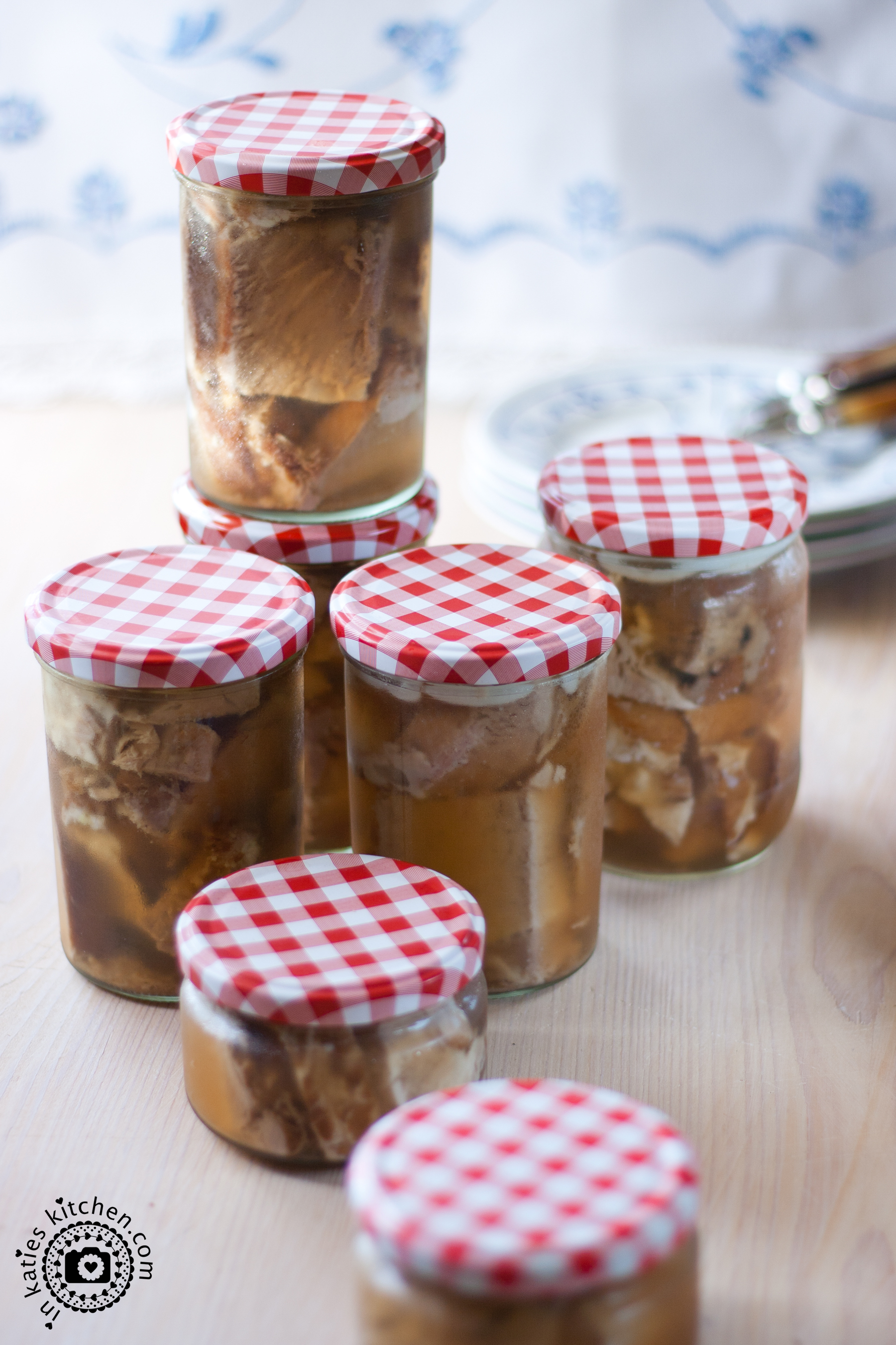 Die Gelatine in Wasser einweichen. Den Sud einmal aufkochen, von der Kochstelle nehmen und die ausgedrückte Gelatine einrühren. Die Brühe darf jetzt nicht mehr kochen, denn das mag die Gelatine nicht. Die Gläser mit dem Sud auffüllen und sofort zuschrauben. Das Fleisch in der Schüssel ebenfalls mit dem Sud bedecken und abkühlen lassen.