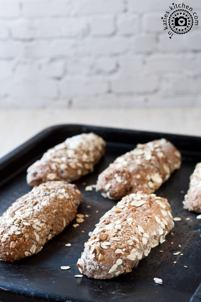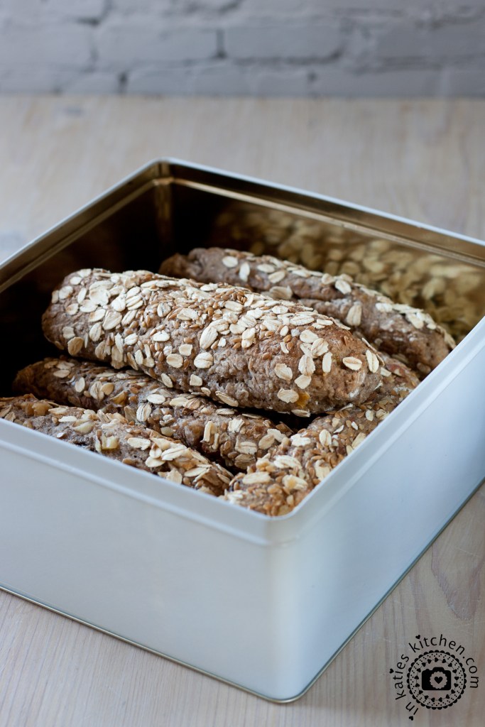 Den Teig in acht gleich große Stücke teilen. Jedes Stück zu einer Rolle formen, in einem Gemisch aus Haferflocken und Leinsamen wälzen und auf ein mit Backpapier ausgelegtes Backblech legen. Die Teiglinge mit einem Küchenhandtuch abgedeckt nochmals eine halbe Stunde ruhen lassen. In der Zwischenzeit den Backofen auf 180°C Ober-und Unterhitze vorheizen. Die Müslistangen 25 Minuten backen.