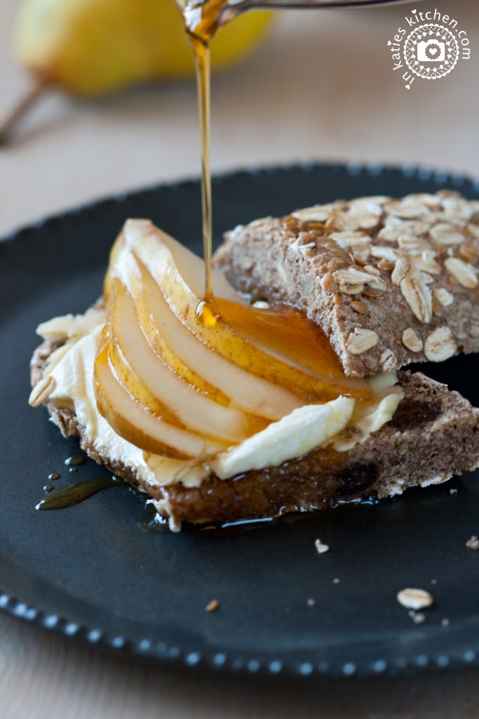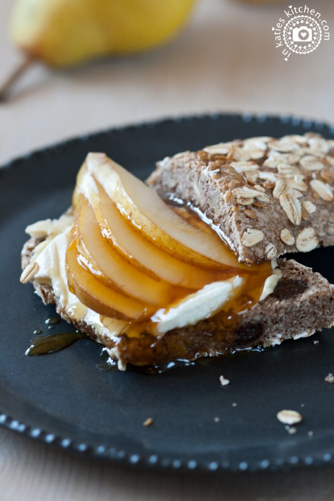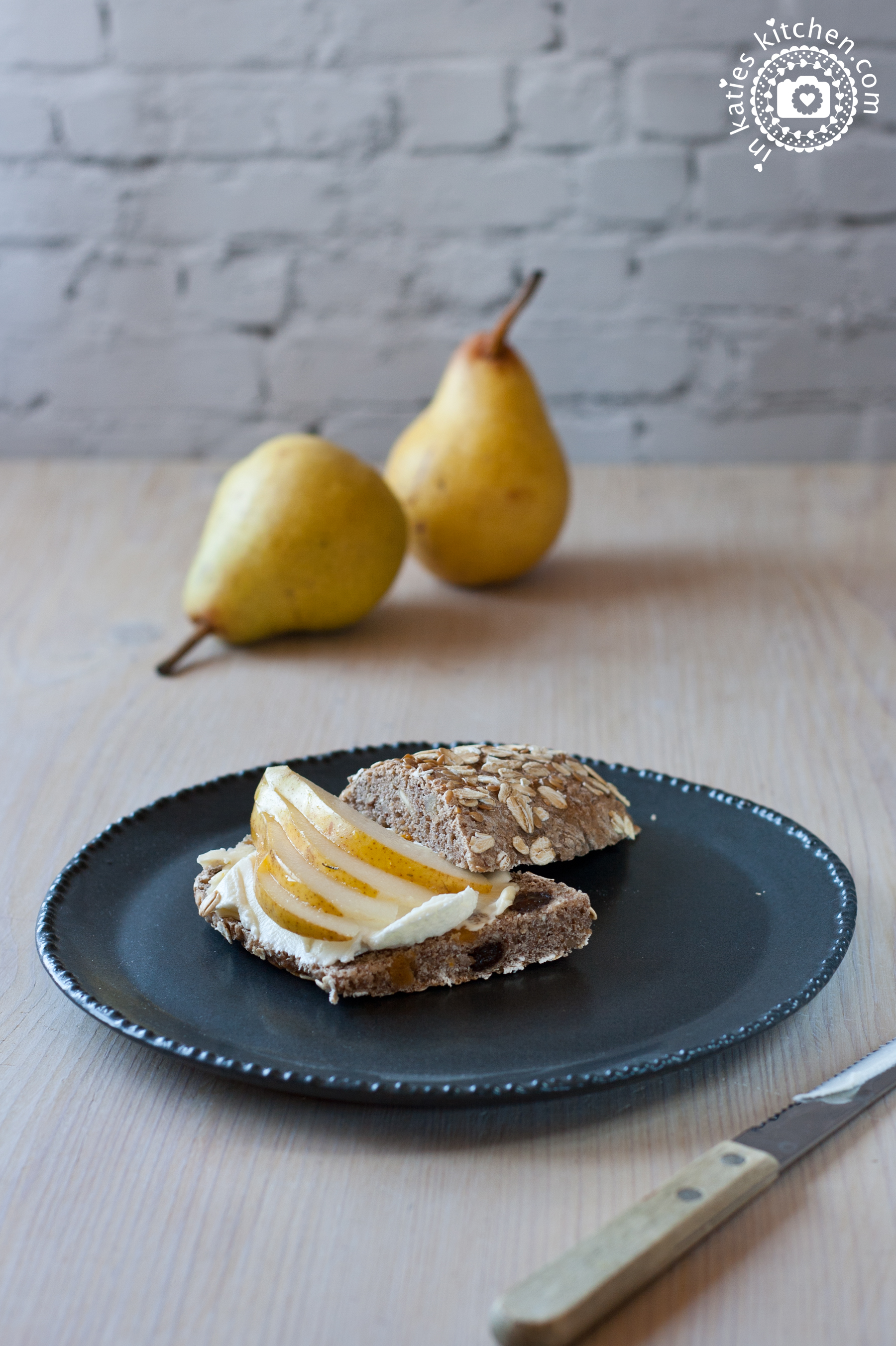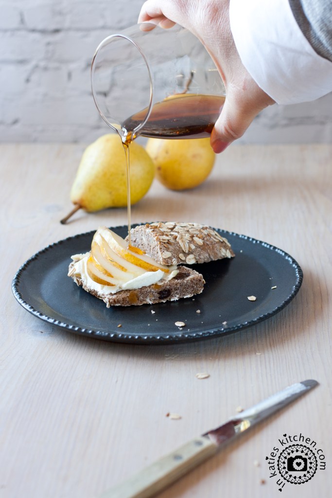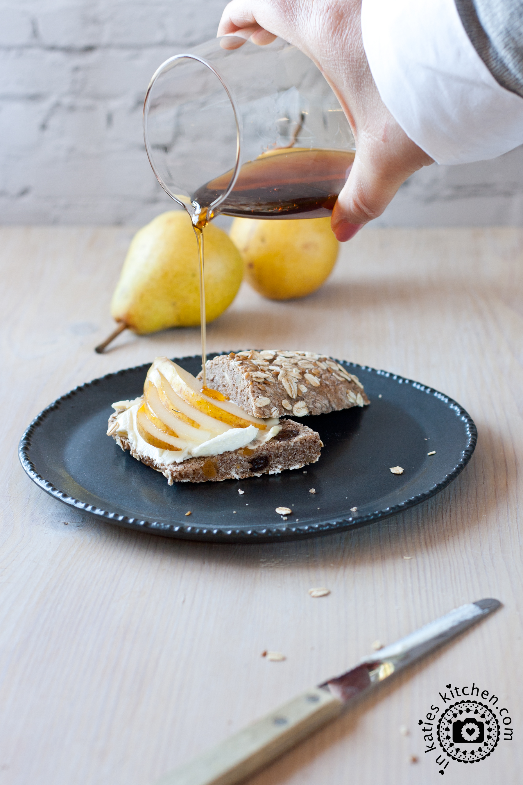 Nachdem sie vollständig abgekühlt sind, lassen sie sich nach Herzenslust belegen. Hier bei mir einfach mit Quark, Birne und etwas Ahornsirup. Etwas mehr Ahornsirup 😂