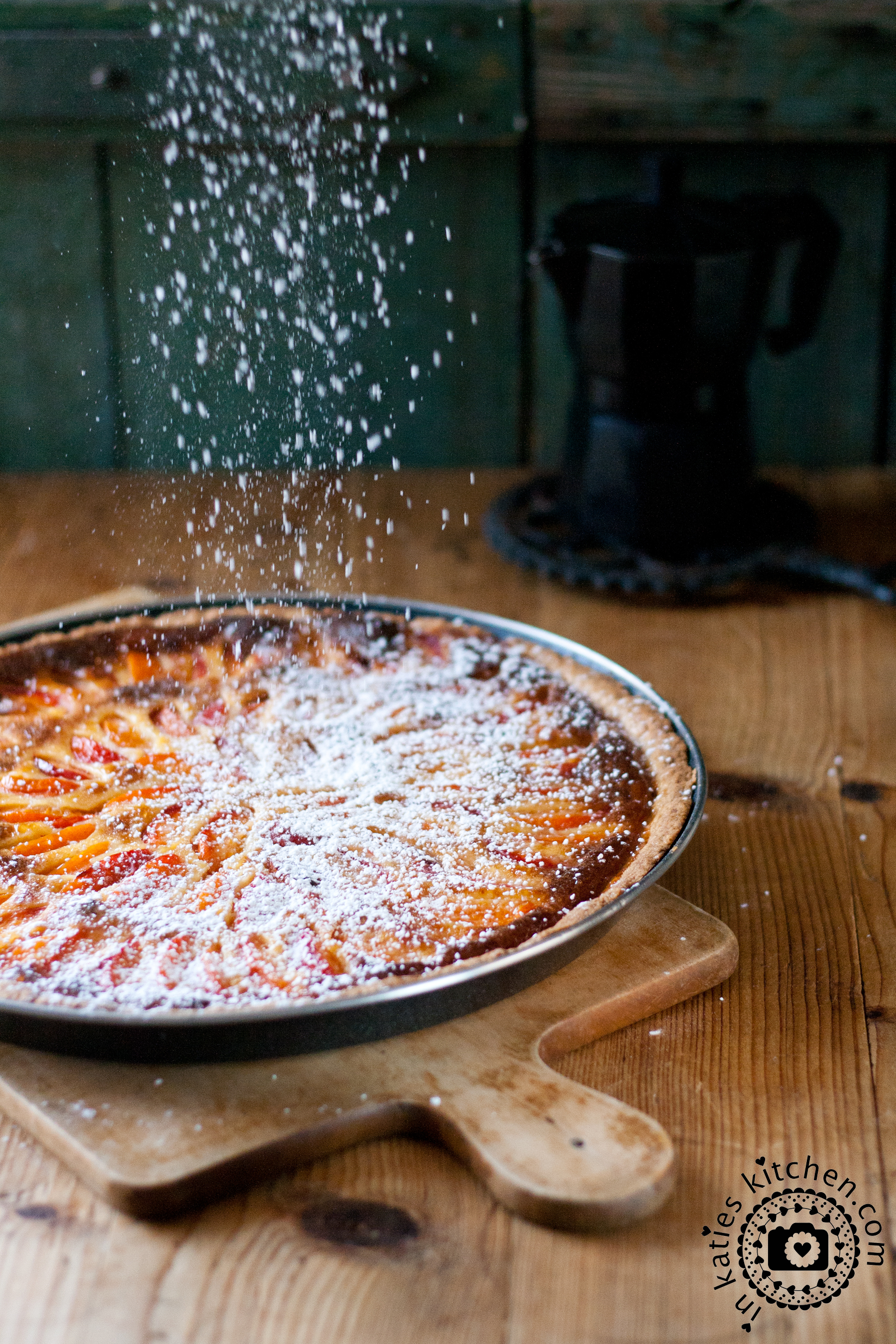 Den Backofen auf 200°C Ober-/Unterhitze vorheizen. Die Form mit dem Teig aus dem Kühlschrank nehmen und mehrmals mit einer Gabel einstechen. Den Guss auf dem Teig verteilen und die Aprikosenspalten hübsch angeordnet auf dem Kuchen verteilen. Die Tarte 20 Minuten bei 200°C backen. Anschließend die Temperatur auf 180°C reduzieren und weitere 15 Minuten goldbraun backen. Den noch heißen Kuchen mit etwas Aprikosenmarmelade bepinseln und abkühlen lassen.