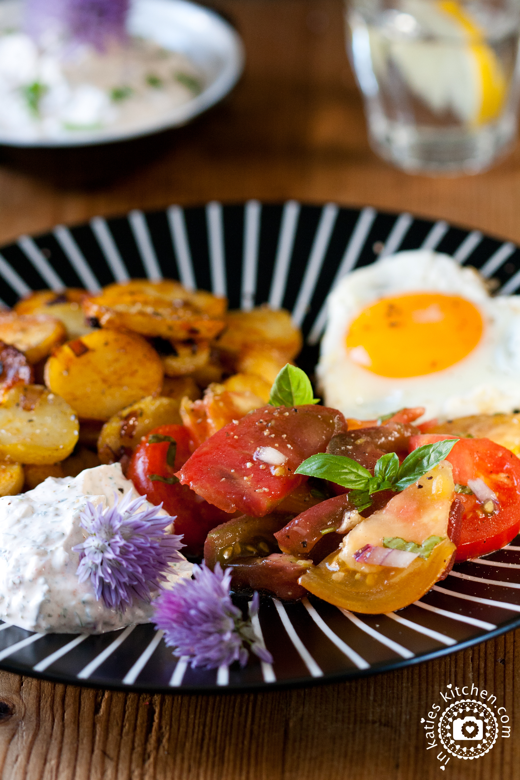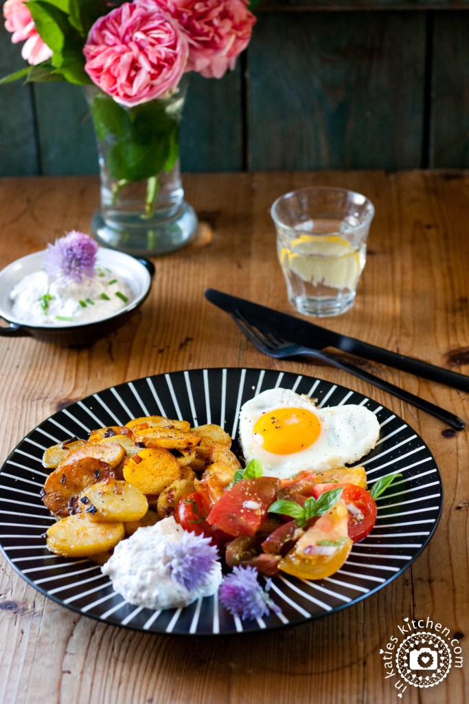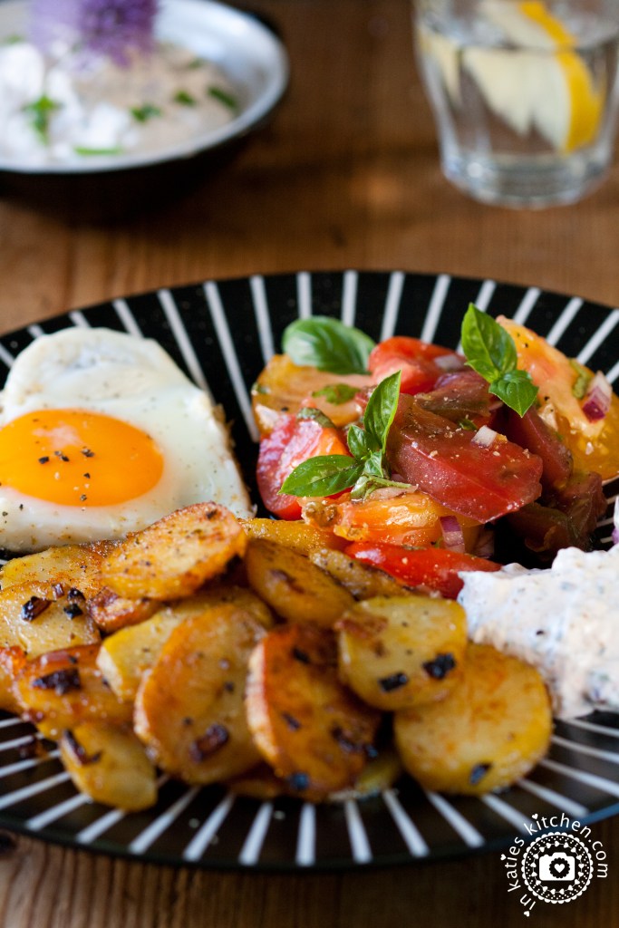 Die Bratkartoffeln mit dem Kräuterquark und dem Tomatensalat auf einem Teller anrichten. Und für mich darf ein Spiegelei in keinem Fall fehlen! Exzellent! 🥰 Guten Appetit!