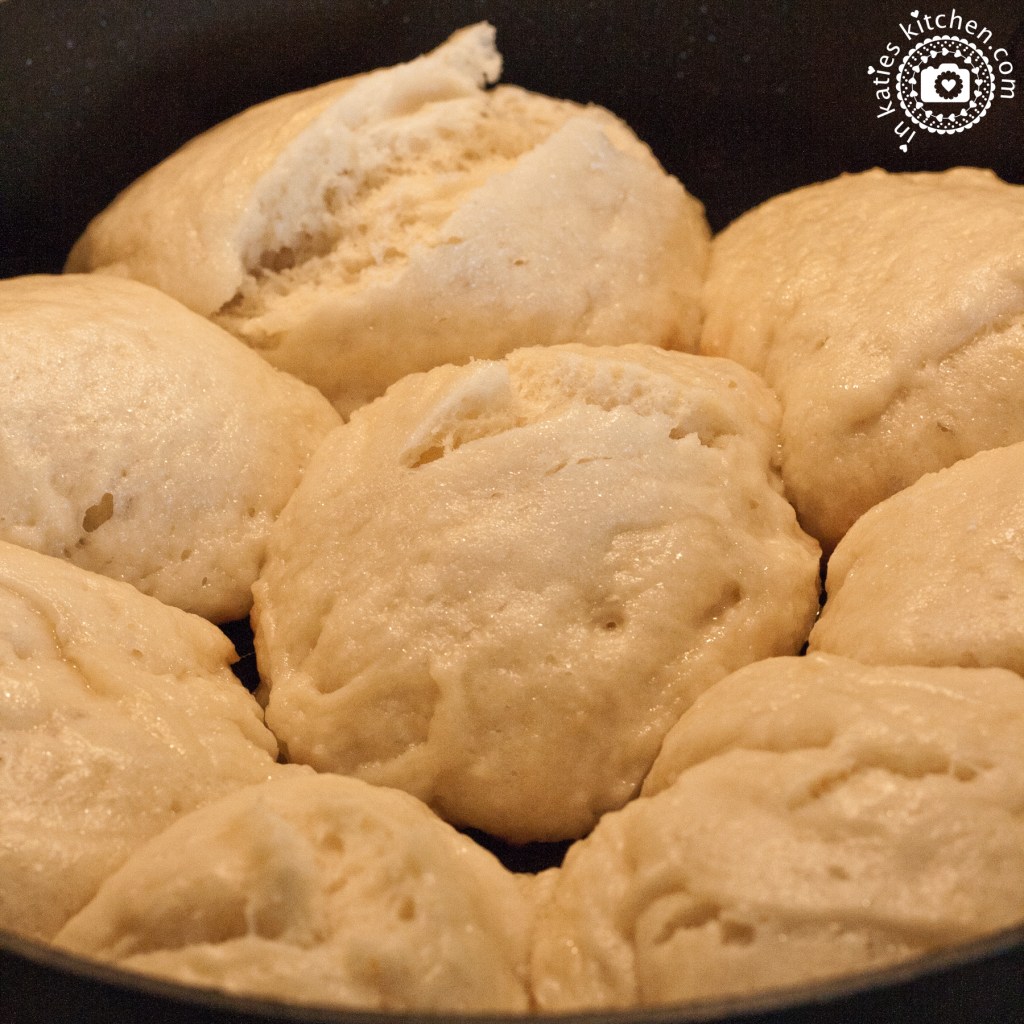 In einer gut schließendenPfanne mit Deckel Öl, wasser und Salz zum Kochen bringen. Die aufgegangenen Teiglinge dicht nebeneinander in die Pfanne setzen und die Dampfnudeln für 15 minuten bei gut geschlossenem Deckel aufziehen. Sobald man die gebackene Kruste riecht, behutsam den Deckel anheben (so dass kein Kondenswasser auf die Dampfnudeln tropft) und die fertigen Dampfnudeln aus der Pfanne heben. Sie sollten schön aufgegangen, oben fluffig und an der Unterseite goldbraun und knusprig sein.