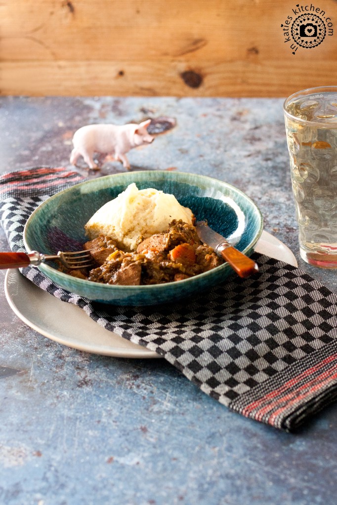 Das Fleisch in dem Schmalz kräftig anbraten. Salzen und Pfeffern. Das Gemüse nach und nach hinzugeben und etwas mit anbraten. Die Gewürze hinzugeben und alles mit 500 ml Wasser ablöschen. Entweder im Backofen mit geschlossenem Deckel bei 200°C zwei Stunden garen oder bei niedriger Temperatur auf dem Herd. Eventuell ab und zu etwas Wasser nachgießen, wenn zuviel verkocht ist. Ich hatte mein Schweinepfeffer für 8 Stunden im Slowcooker. Das hat auch sehr gut geklappt. In manche Rezepte kommt Schweineblut zum Andicken. Das brauche ich nun nicht, dafür habe ich ganz zum Schluss fünf Stückchen dunkle Schokolade dazu gegeben.