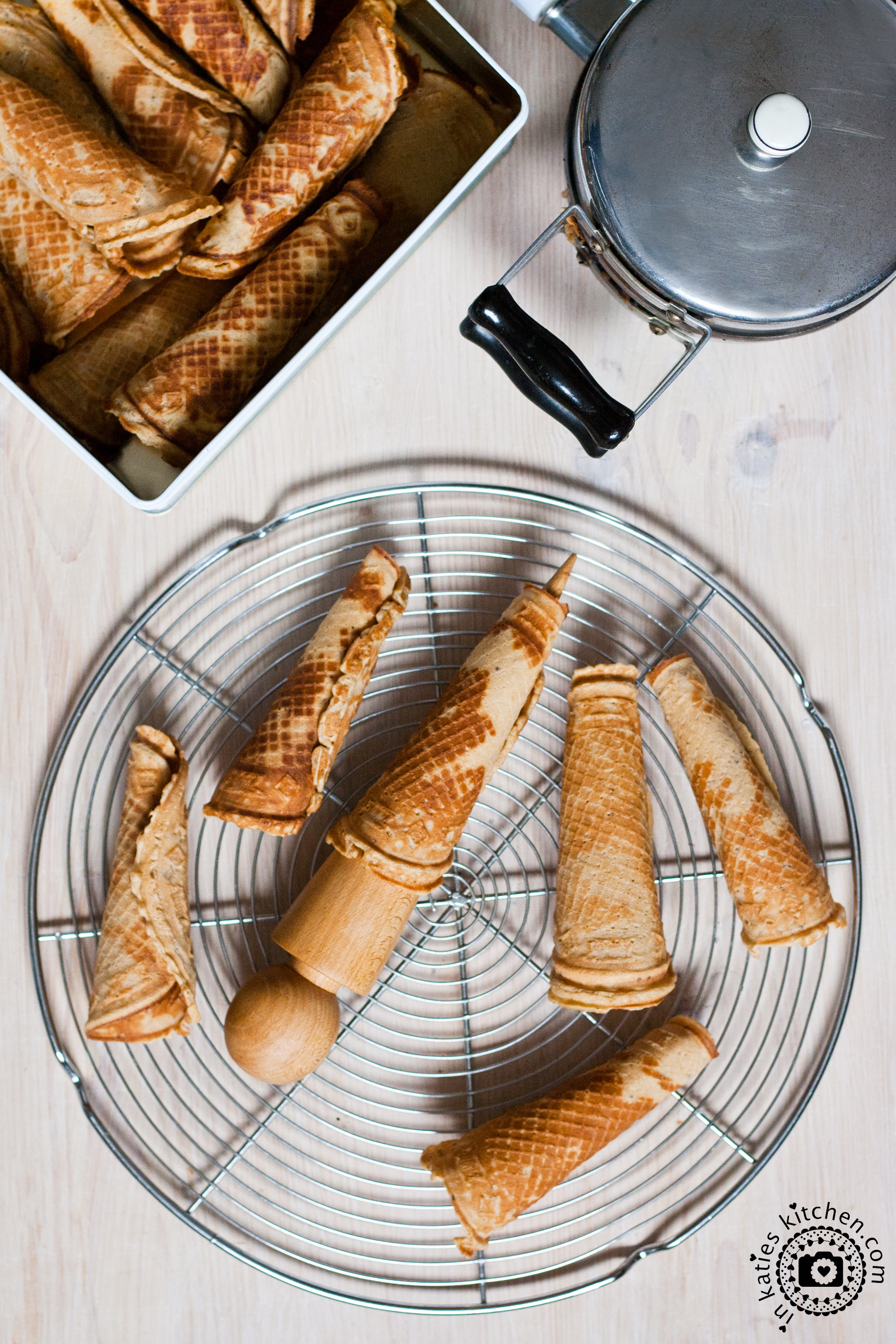 Das Wasser erwärmen, den Kandis darin auflösen und die Flüssigkeit anschließend vollständig abkühlen lassen. Die Butter zerlassen und ebenfalls ein bisschen abkühlen lassen. In einer Schüssel Mehl, Salz, Anis, Kardamom und Zimt mischen. Nach und nach das Kandiswasser hinzugießen und alles gut miteinander verrühren, so dass sich keine Klümpchen bilden. Zum Schluss die Eier, die flüssige Butter und den Rum unterrühren. Den Teig nun am besten über Nacht in den Kühlschrank stellen. Am nächsten Tag das Waffeleisen erhitzen und die Waffeln abbacken. Sobald eine Waffel aus dem Waffeleisen kommt, wird sie direkt zu einer Rolle oder mit einem Hörnchenholz zu einer Tüte geformt. Das muss sehr schnell gehen, denn das Gebäck wird sehr schnell fest und knusprig sobald es etwas abkühlt. Dann lässt sich seine Form nicht mehr verändern. Während des Backens erkärt sich auch, warum diese Waffeln mancherorts Piepkuchen genannt werden – sie pfeifen beim Backen! 🤣