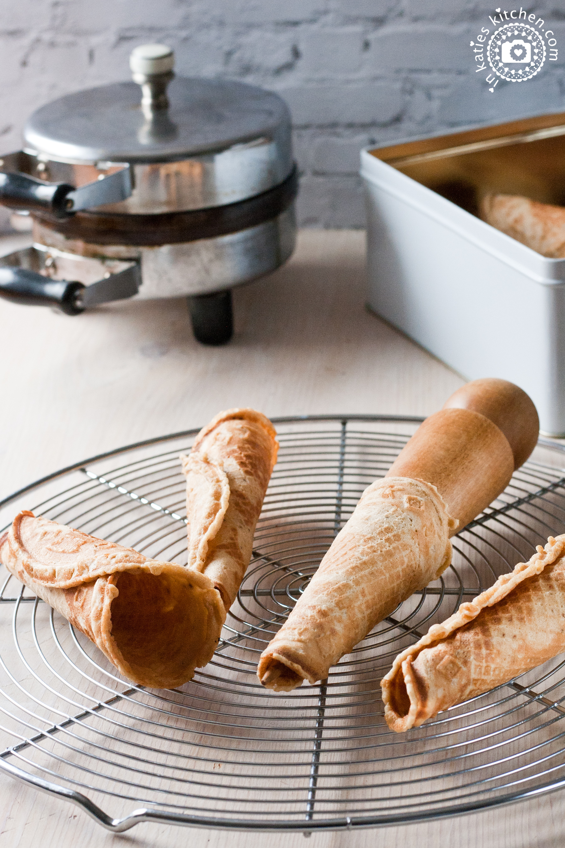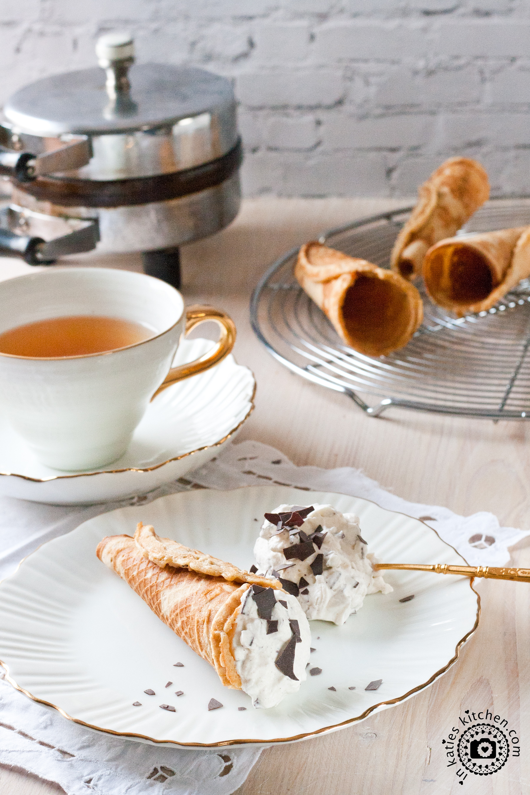 Auch bekannt als Eiser- oder Neujahrskuchen werden diese Hohlhippen oder Waffelhörnchen in vielen Teilen unseres Landes zum Jahresanfang gebacken. Man kann sie einfach so wegknabbern, mit Schlagsahne füllen oder als Eiswaffeln verwenden. Möglichkeiten über Möglichkeiten! 😊 Meine habe ich dieses Mal mit Schoko-Kardamom-Sahne gefüllt. Ihr könnt aber auch Erdbeeren oder Himbeeren in die Schlagsahne geben, wenn ihr es lieber fruchtig mögt. Man benötigt allerdings ein Hörncheneisen.