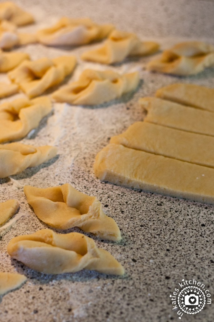 Die Butter mit dem Zucker und der Salzprise in einer Schüssel cremig rühren. Nach und nach die Eier unterrühren. Die Milch hinzufügen und zum Schluss das Mehl unterarbeiten. Das geht dann am besten mit den Händen. Den Teig eine halbe Stunde ruhen lassen. Anschließend den Teig auf einer bemehlten Fläche ca. o,5 cm dick ausrollen und in 3 cm breite Streifen schneiden. Die einzelnen Streifen wiederum in etwa 5 cm lange Rechtecke. Jedes Rechteck in der Mitte der Länge nach 2 cm einschneiden und ein Teigende hindurchziehen (siehe Foto).