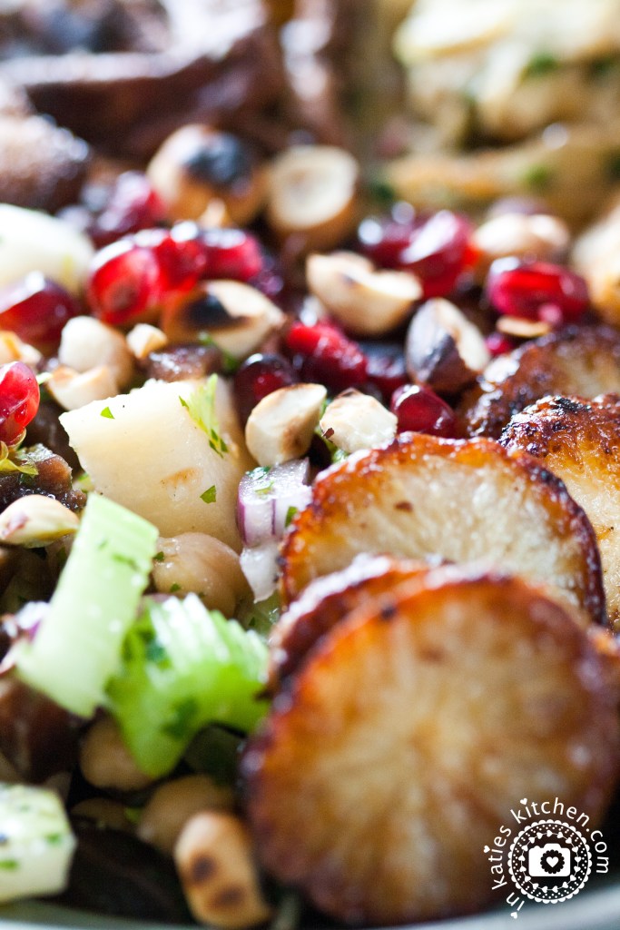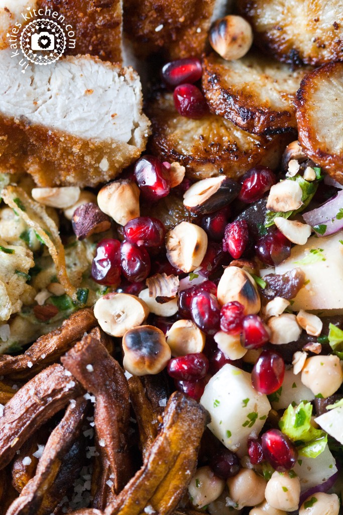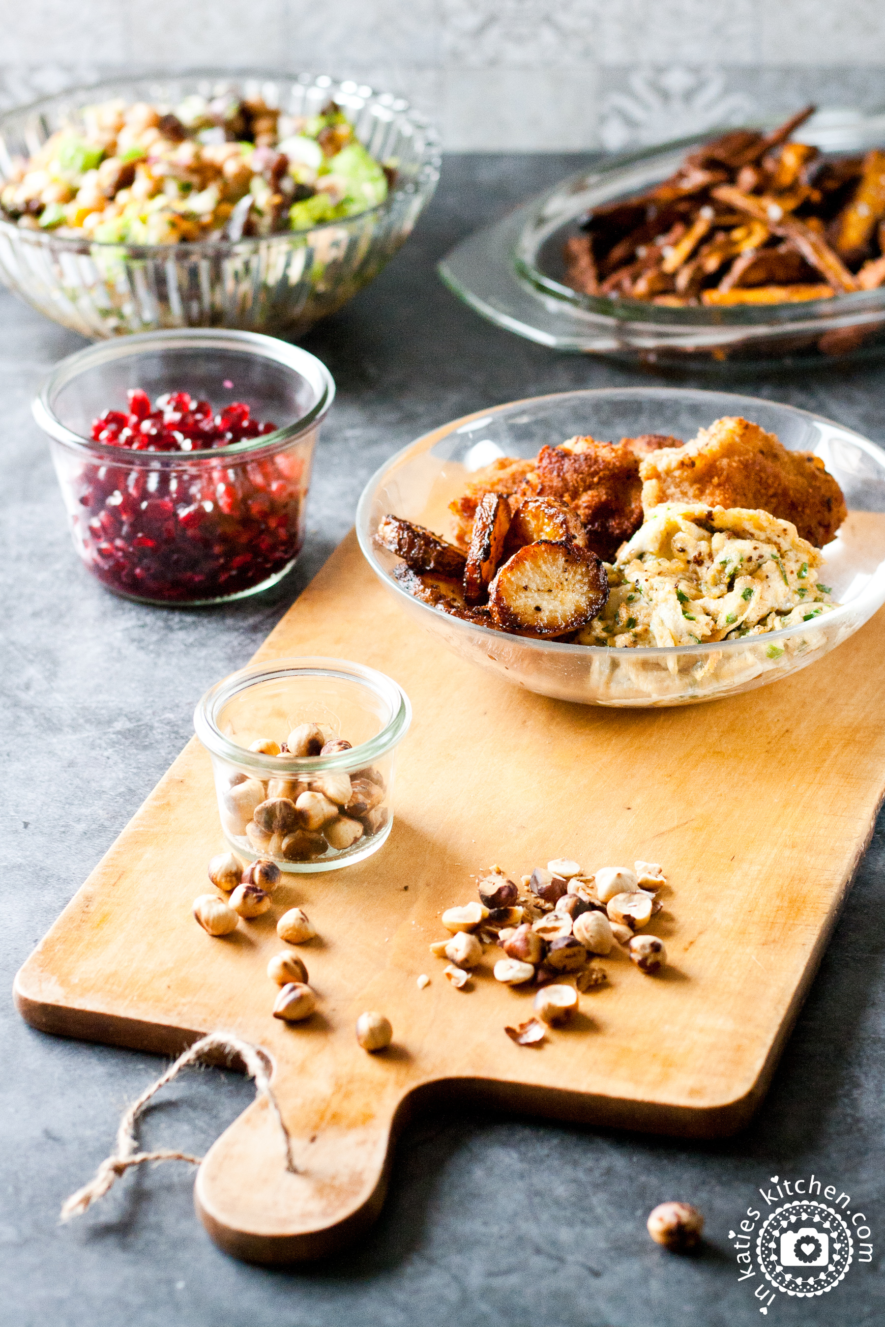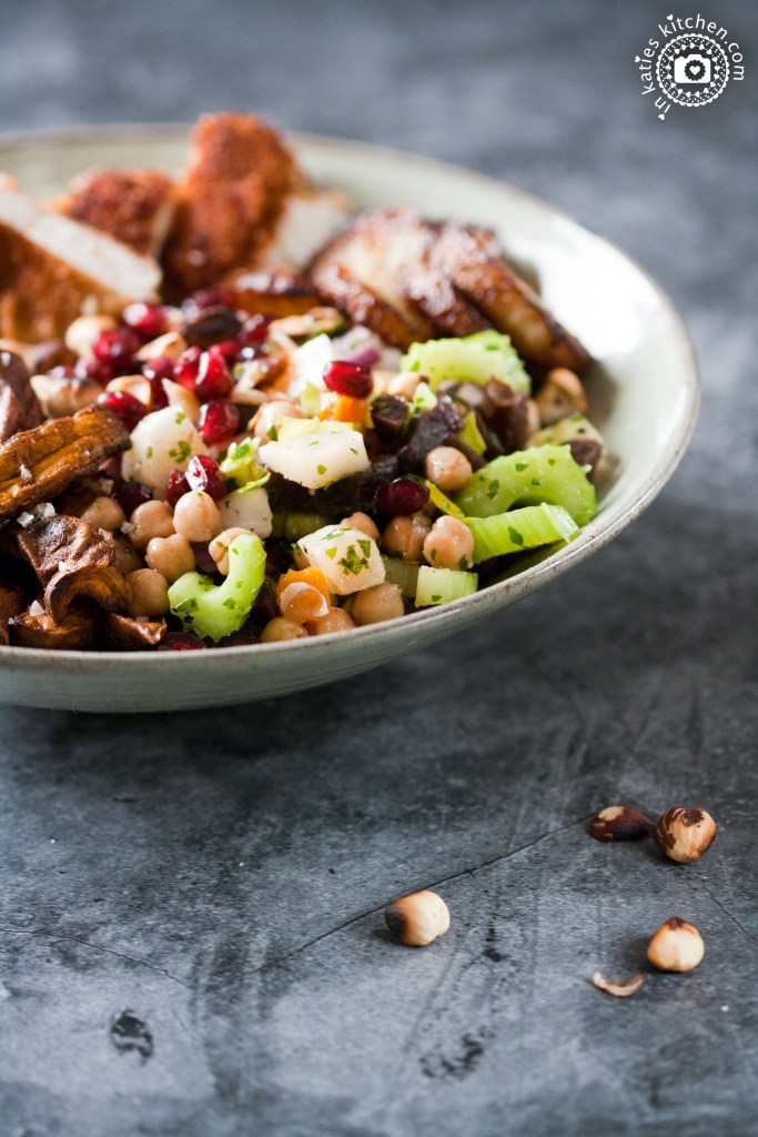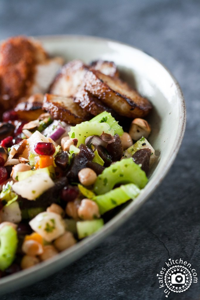 Zu gebratenen Yacónscheiben gesellen sich in dieser bunten Schale neben fruchtigem Kichererbsensalat mit frischer Yacón und Staudensellerie gebackene Süßkartoffelspalten, etwas orientalisch gewürztes, knuspriges Hähnchenbrustfilet, Granatapfelkerne und geröstete Haselnusskerne.