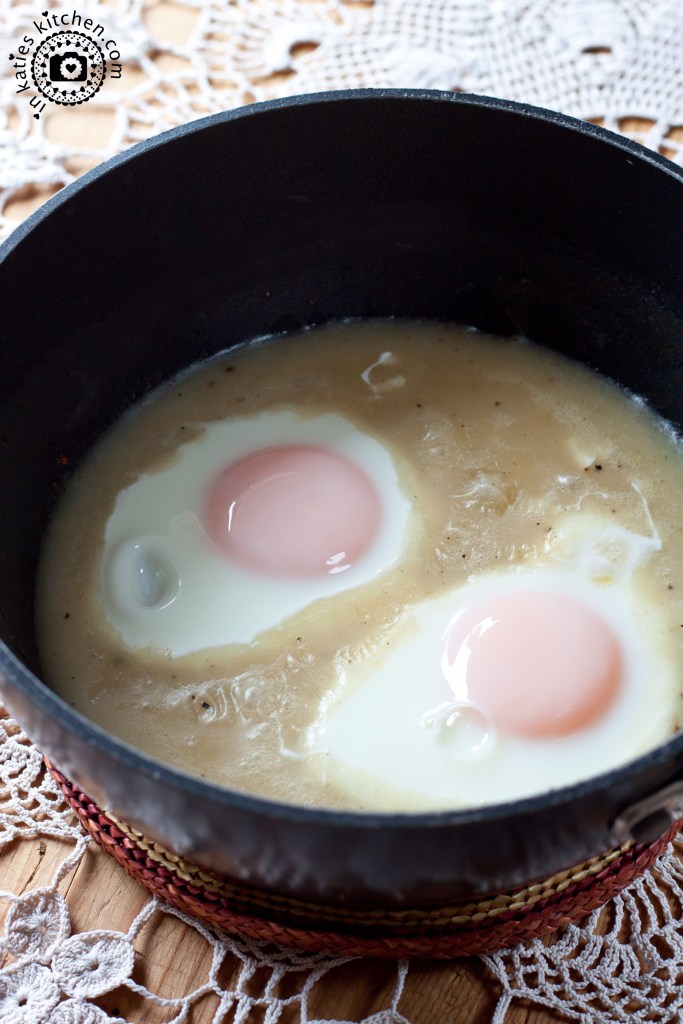 Den Topf mit einem Deckel verschließen und die Eier bei niedriger Temperatur circa 6-7 Minuten in dem Sößchen gar ziehen lassen.