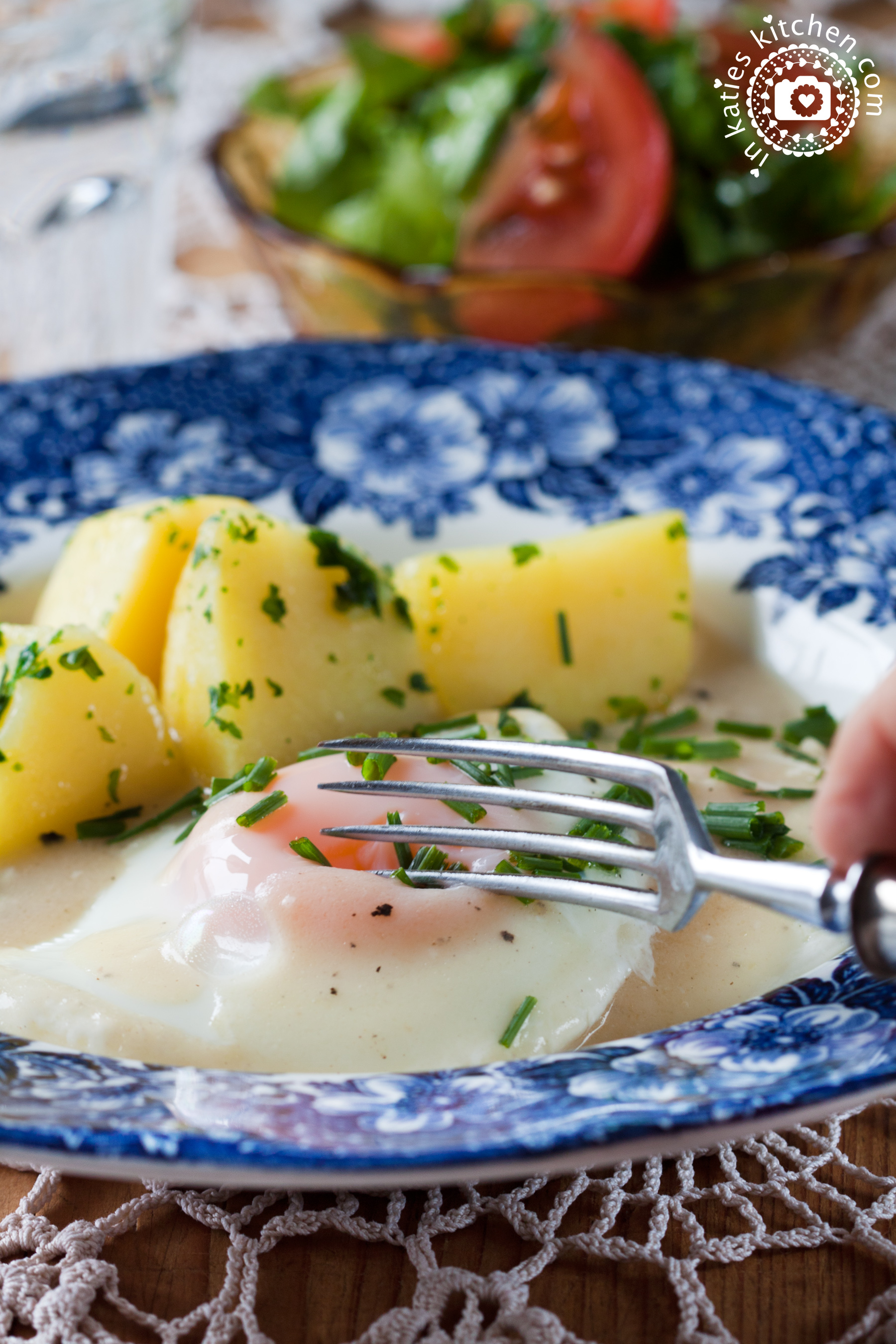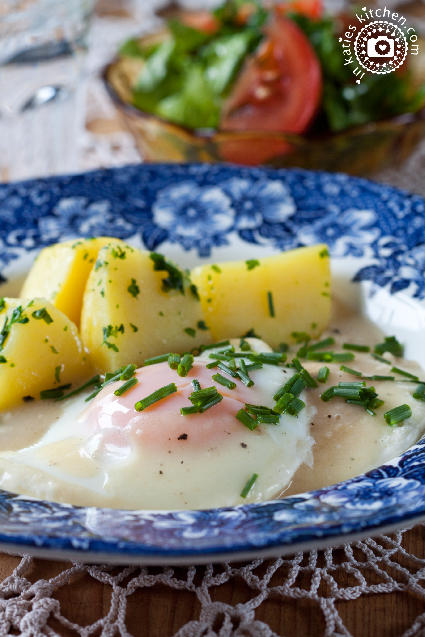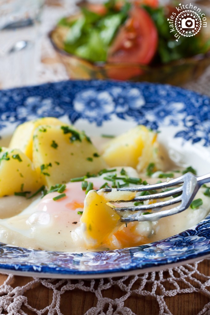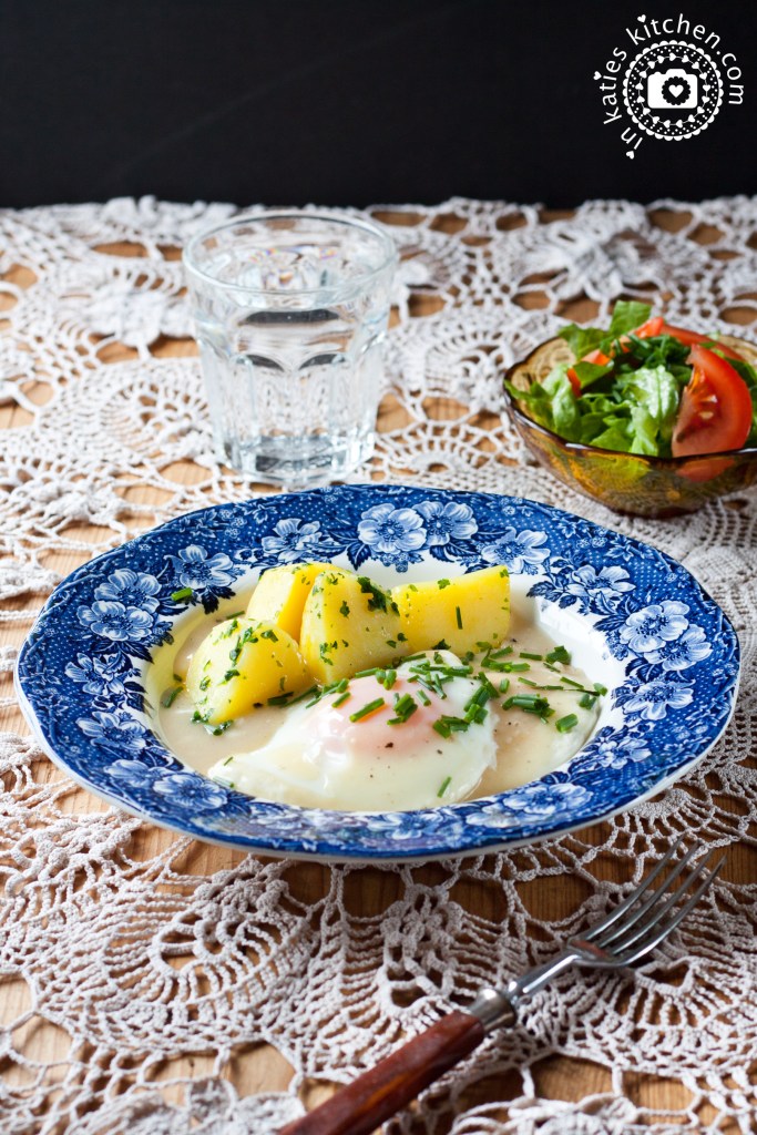 Die Sauren Eier mit Salzkartoffeln und Salat servieren und genießen.