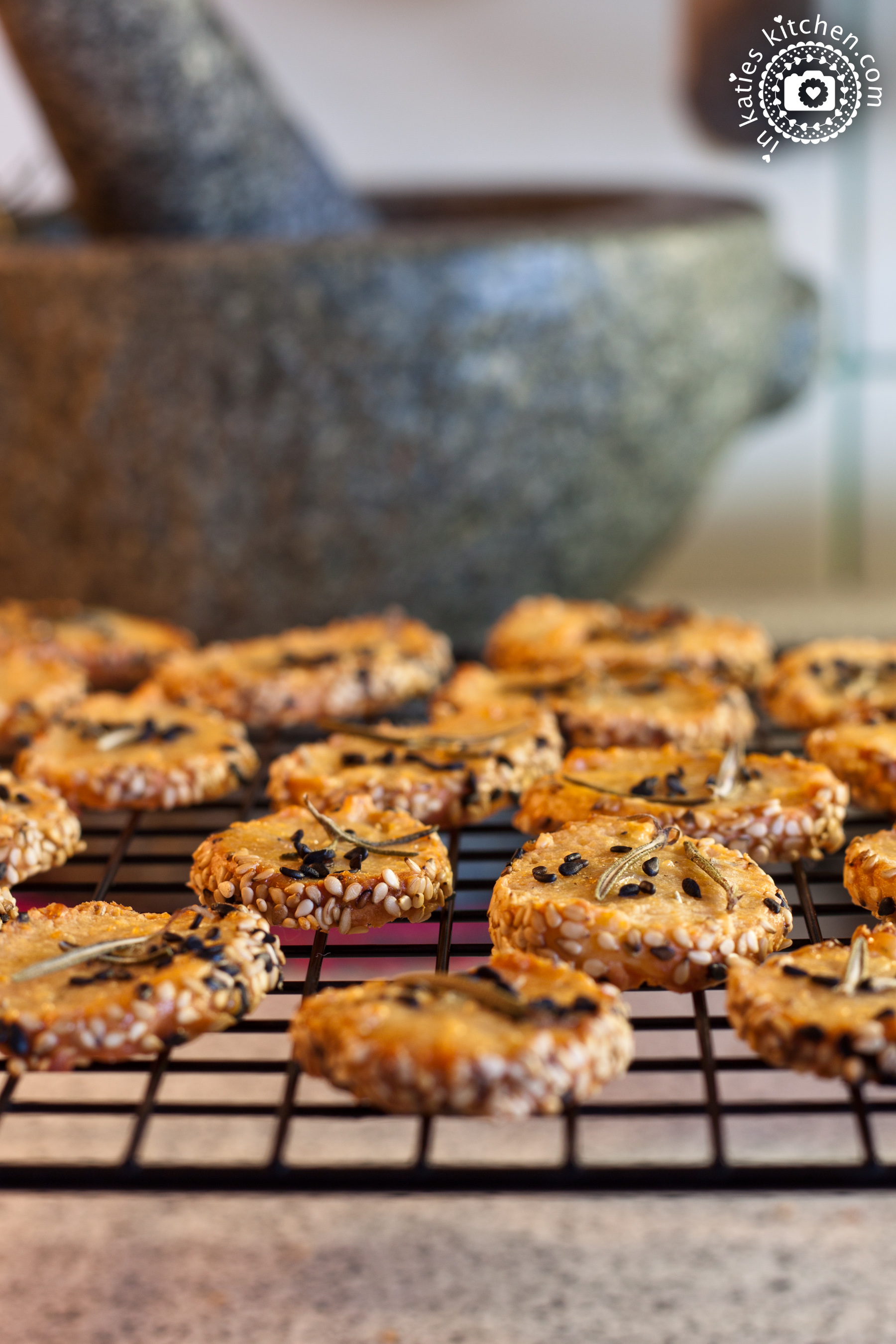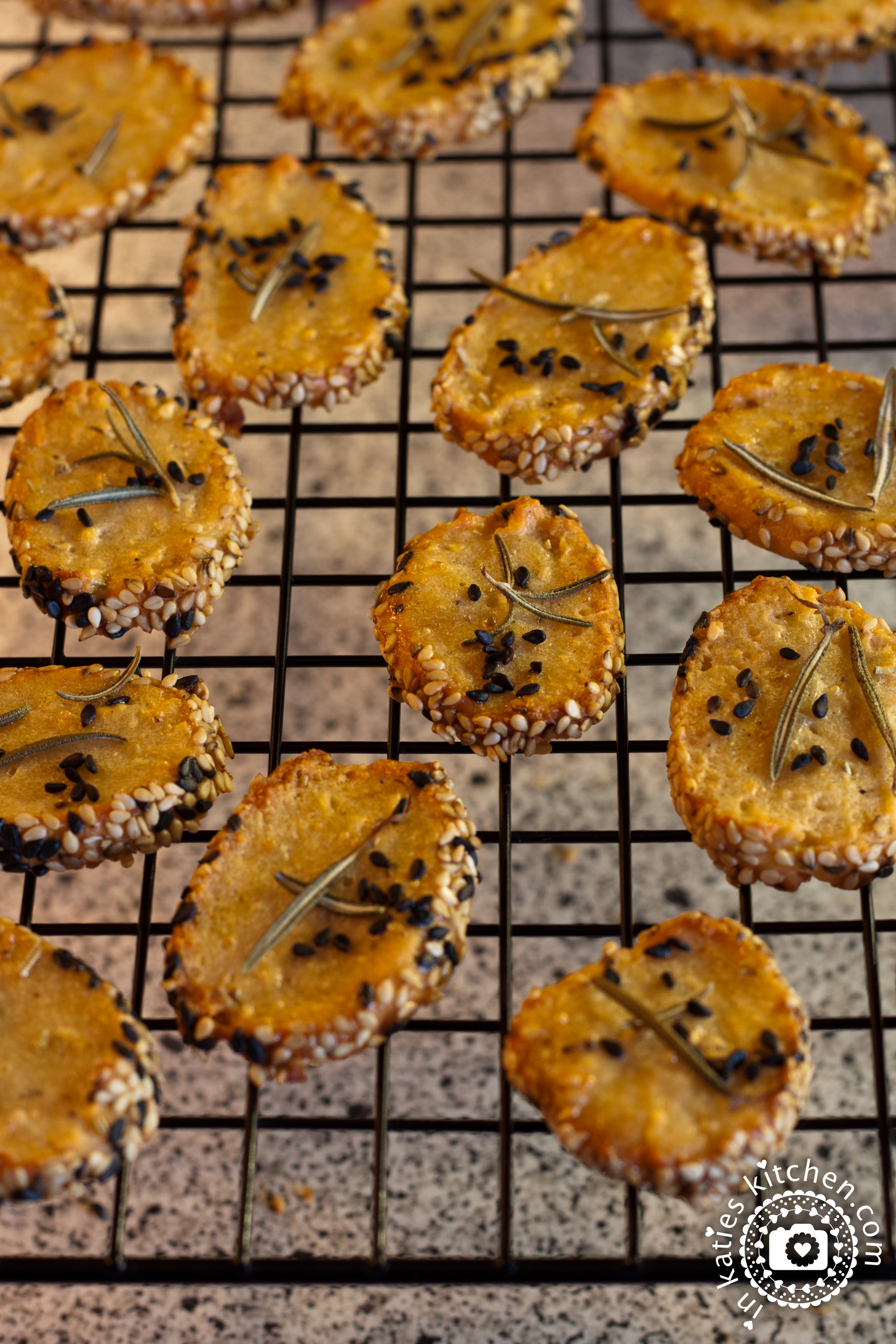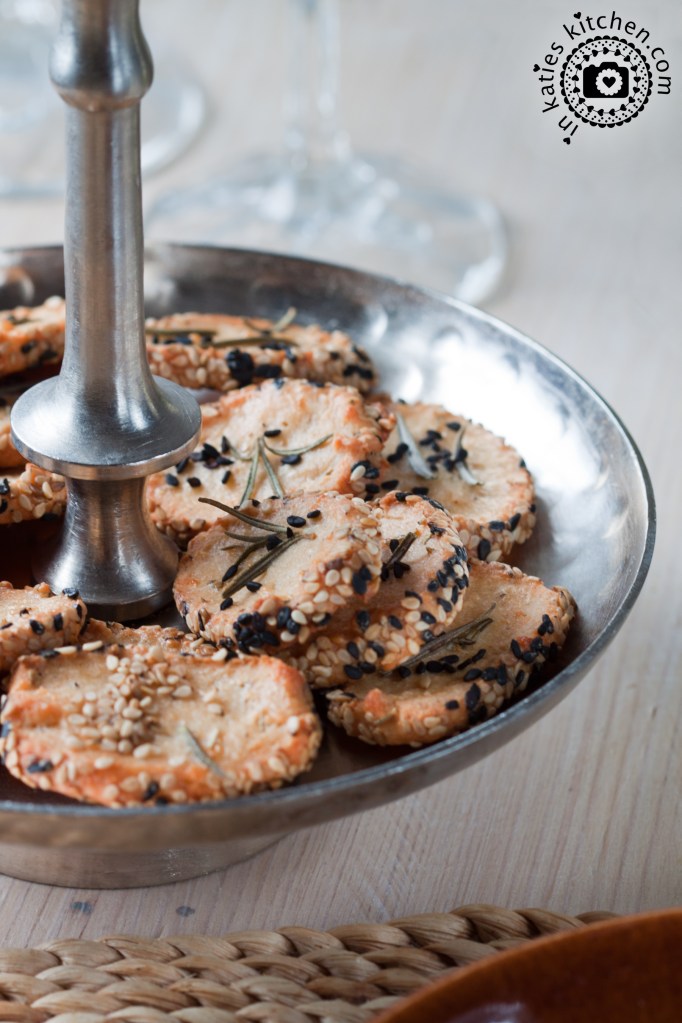 Anschließend den Backofen auf 200°C Ober-/Unterhitze vorheizen und ein Backblech mit Backpapier belegen. Von der Teigrolle ca. 5 mm dicke Scheiben abschneiden und diese mit etwas Abstand auf das vorbereitete Backblech legen. Die Kräcker oben mit etwas Wasser bepinseln und mit ein paar frischen Rosmarinblättchen und Sesam-/Schwarzkümmelkörnchen belegen. Das Käsegebäck für ca. 20 Minuten golbraun backen.