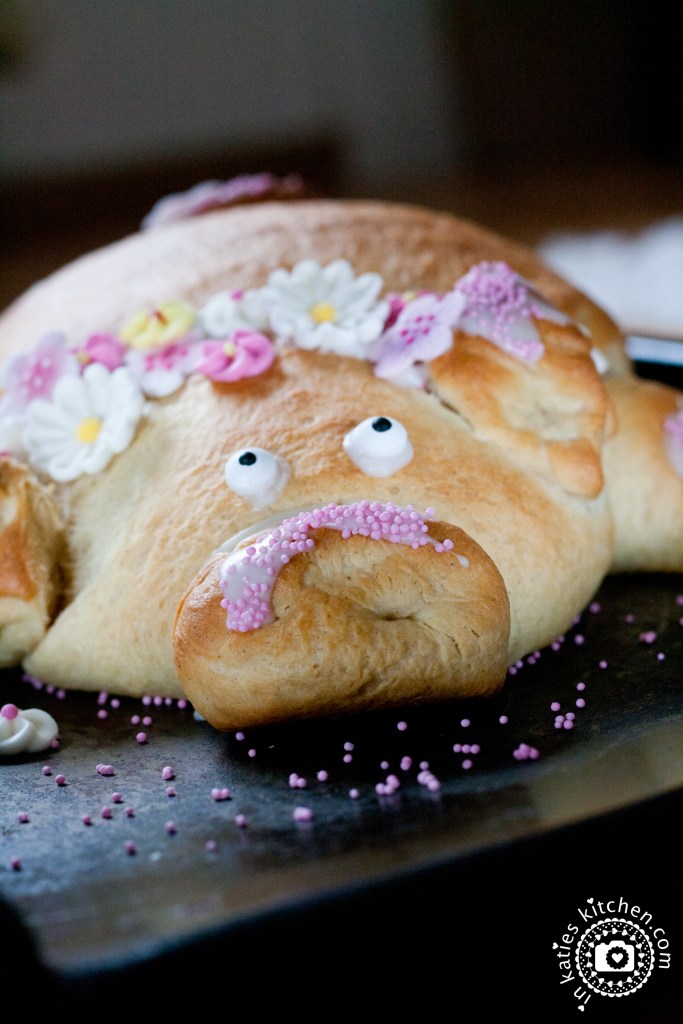 Ich habe als Augen keine Rosinen genommen, sondern Zuckeraugen. Hierfür einfach etwas Puderzucker mit sehr wenig Wasser verühren und damit die Augen und eventuelle Verzierungen wie Zuckerperlen und Blumen auf euer Schweinchen kleben.