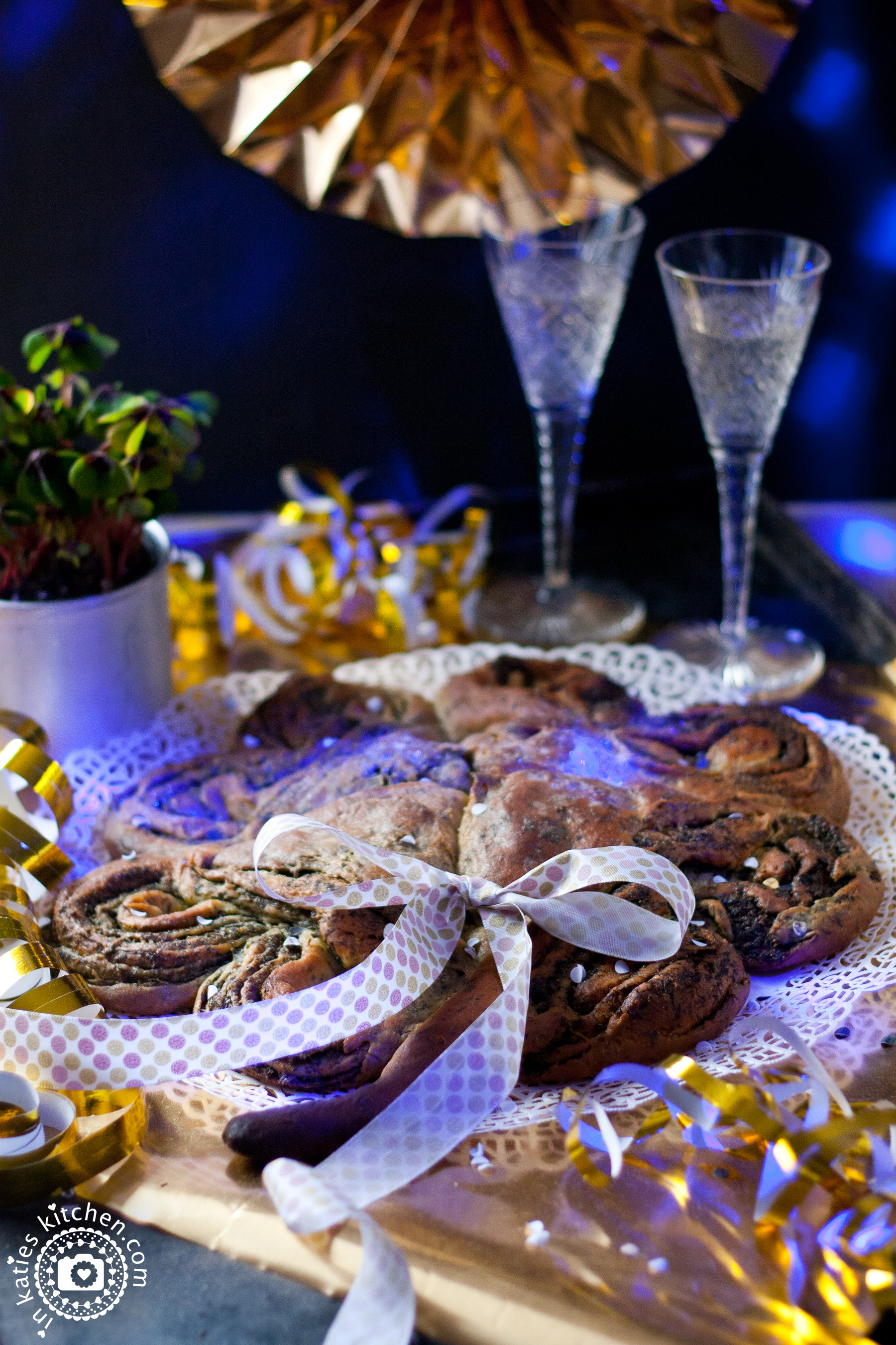 Wenn der Hefeteig gut aufgegangen ist, wird er nochmals kurz durchgeknetet und auf einer bemehlten Fläche auf die Größe von 60 cm x 40 cm etwa 1 cm dick ausgerollt. Nun den Teig gut mit Blutorangengelee (ca. 200 g) bestreichen und mit dem vorbereiteten Marzipan belegen. Das Teigrechteck von der langen Seite her aufrollen. Die Rolle mit einem scharfen Messer der Länge nach aufschneiden und die beiden so entstandenen Stränge umeinender drehen und zu einem Kranz formen. Vorsichtig auf ein mit Backpapier ausgelegtes Backblech manövrieren. Das ist eine glitschige Angelegenheit, aber ruhig Blut, mit einem Tortenblech oder einem größeren Pfannenwender bekommt man das hin.