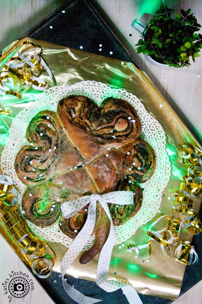 Alle Zutaten zu einem glatten Hefeteig verarbeiten und den Teig abgedeckt an einem warmen Ort gehen lassen, bis er sich in etwa verdoppelt hat. Anschließend nochmals gut durchkneten und eventuell noch etwas Mehl einarbeiten, bis der Teig nicht mehr klebt. Aus einem kleinen Stück Teig für das Kleeblatt einen Stiel rollen. Den restlichen Teig in vier gleich große Stücke teilen und diese zu Kugeln formen. Aus jeder Teigkugel nun jeweils ein Herz formen. Hierfür die Teigkugel dünn ausrollen und mit Kräuterbutter bestreichen. Anschließend die Teigplatte aufrollen und diese Teigrolle in der Mitte falten, so dass die beiden Rollenhälften aufeinander liegen. Die offenen Enden spitz zusammendrehen. Von der gefalteten Seite her den Strang der Länge nach zu 3/4 einschneiden und die beiden so entstandenen Schlaufen nach außen drücken, so dass ein Herz entsteht. Oh je, versteht man das? 😅 Hätte ich doch bloß ein paar Schritt-für-Schritt Fotos gemacht…