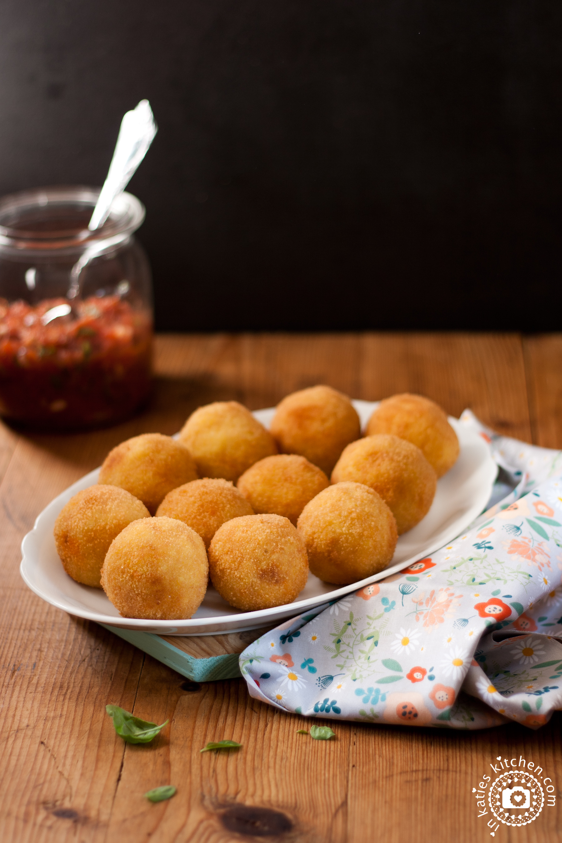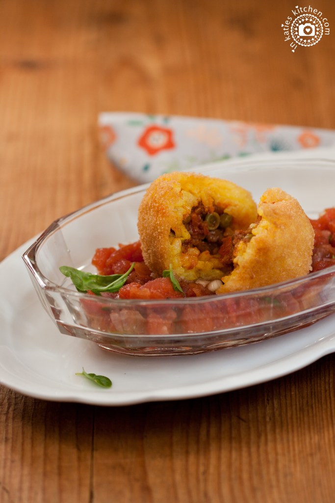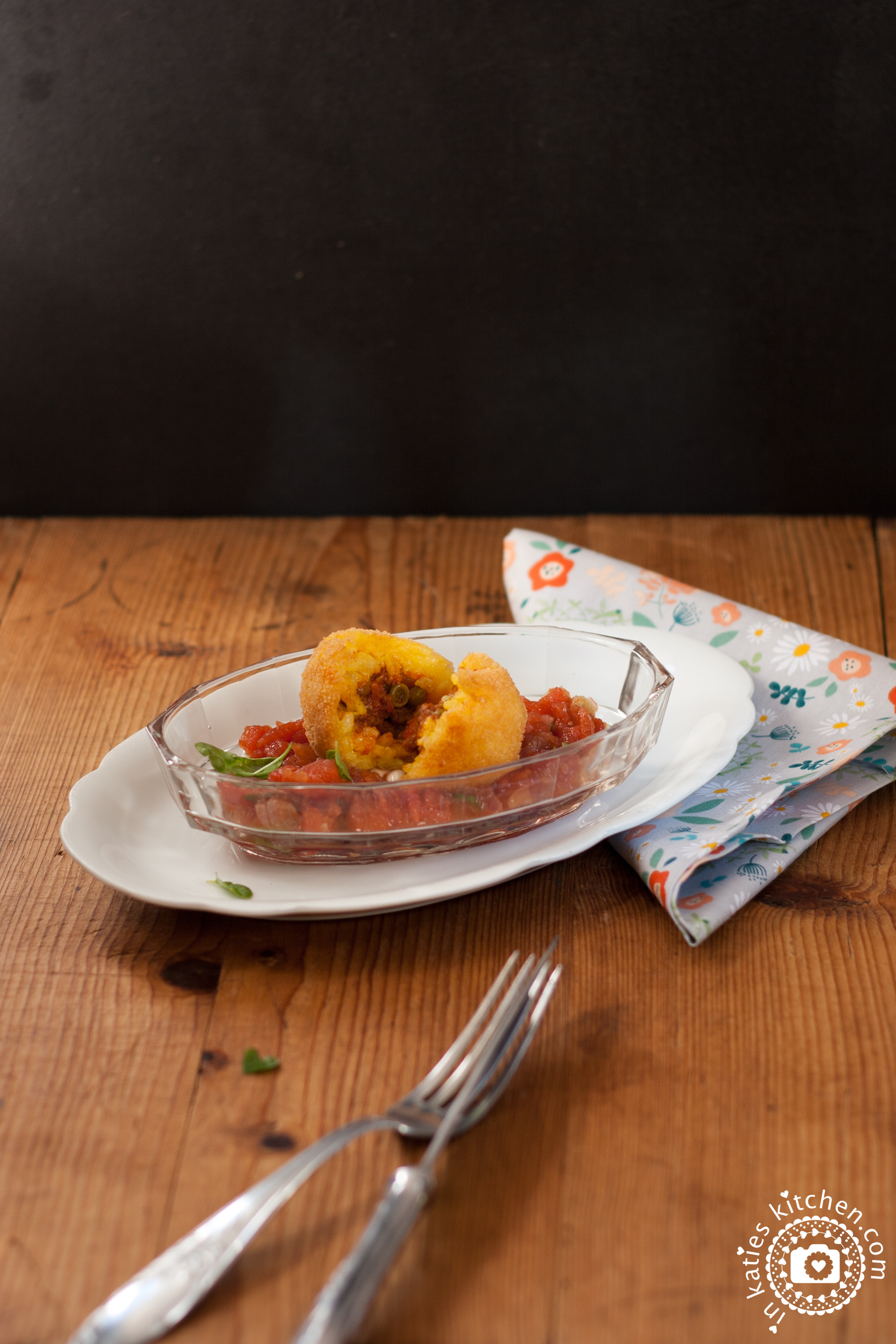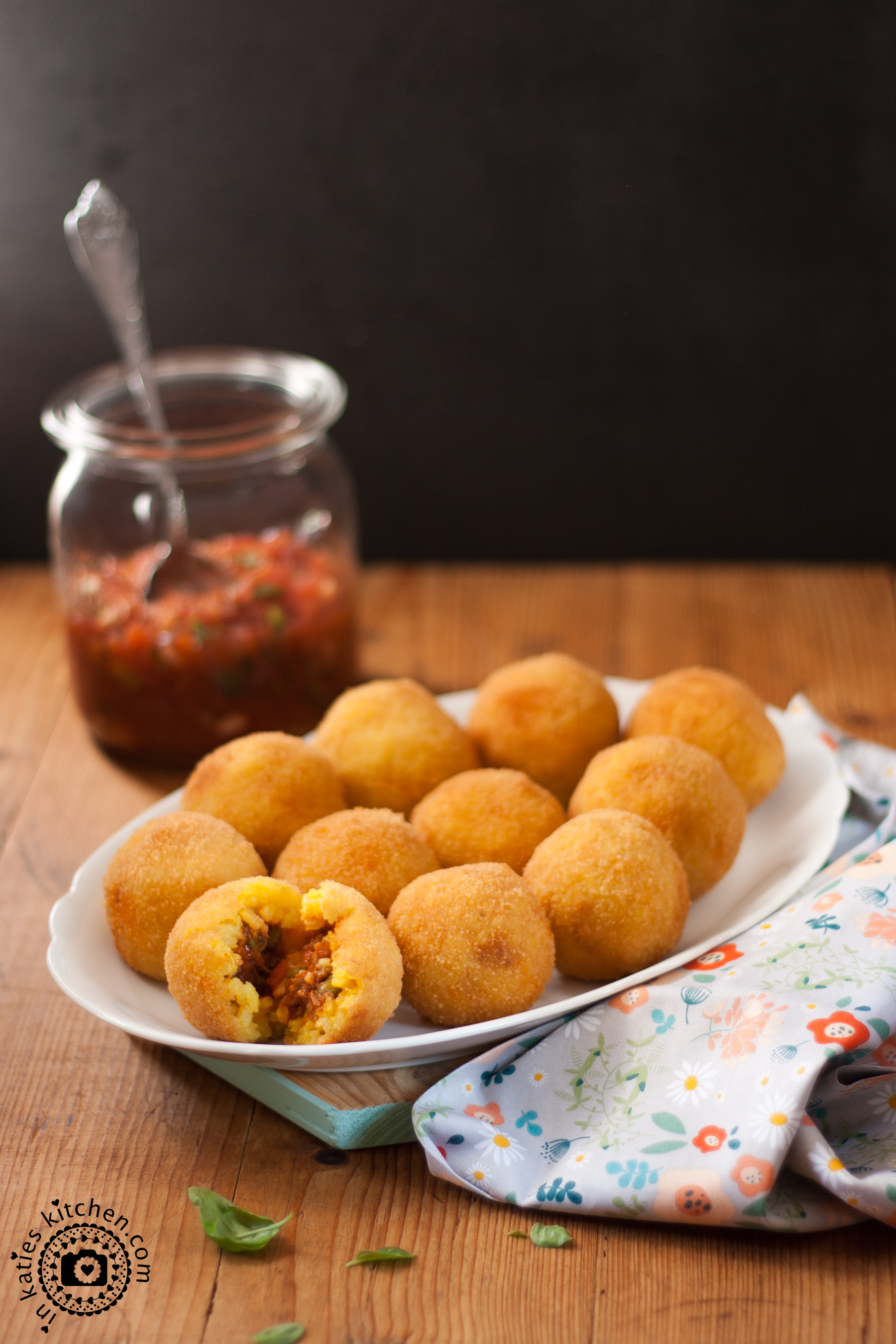 Anlässlich des heutigen Weltkrokettentages mussten einfach diese knusprig fritierten Bällchen auf den Teller. Jedes Land hat so seine eigenen Kroketten, da ist die Auswahl riesig und ich konnte mich kaum entscheiden, in welche Richtung es gehen sollte. Mit Kartoffeln oder Reis, mit Füllung oder ohne, Fleisch, Gemüse oder gar Süßes? Da Reisen zu unseren Sehnsuchtsorten ja zur Zeit nicht möglich sind, geht’s jetzt zumindest kulinarisch und mit dem Finger auf der Landkarte nach bella Italia. Außen kross, mit einem fluffigen Mantel aus Risotto mit Safran und einer aromatischen Füllung aus Hackfleisch und Fenchel ein Happen, der richtig Spaß auf mehr macht. Ich gebe ja zu, sie sind schon etwas zeitaufwendig und man braucht viel Geduld beim Füllen und Rollen, aber die Mühe lohnt sich. Mit einer pikanten Tomatensauce und den Klängen eines italienischen Radiosenders serviert, fühlt man sich fast, als wäre man im sonnigen Italien.