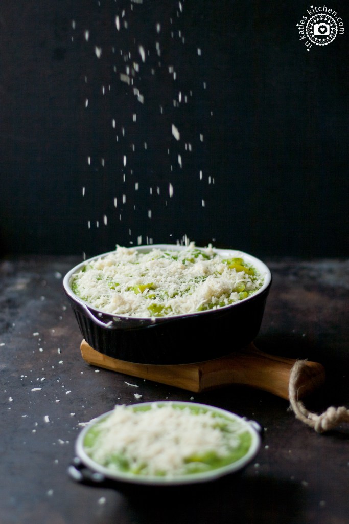 150 ml Brühe angießen und bei mittlerer Hitze köcheln lassen, bis der Reis die Flüssigkeit aufgenommen hat. Dabei immer mal wieder umrühren. Diesen Vorgang wiederholen, bis die Brühe aufgebraucht ist und der Reis nach ca. 18 Minuten bissfest gar ist.