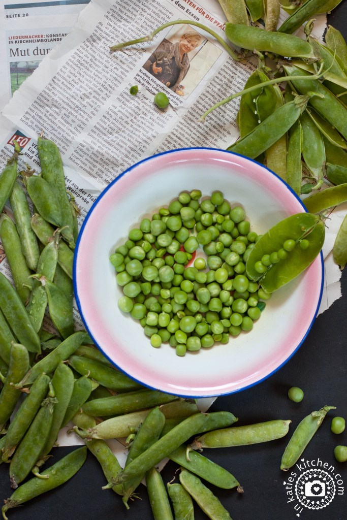 Glück, wer einen Gemüsegarten hat, denn zur Zeit kann man so richtig aus dem Vollen schöpfen. Die Beete sind üppig gefüllt, mit Früchten aller Arten und Farben. Aber auch auf dem Markt und in den Gemüseabteilungen der Supermärkte findet sich Allerlei regional Gewachsenes, was gerade Hochsaison hat. Mir haben es kürzlich diese frischen Erbsen in ihren knallgrünen Hülsen angetan. Schon als Kind habe ich sie bei Oma im Garten gerne aus ihren Schoten gepult und direkt roh verspeist.