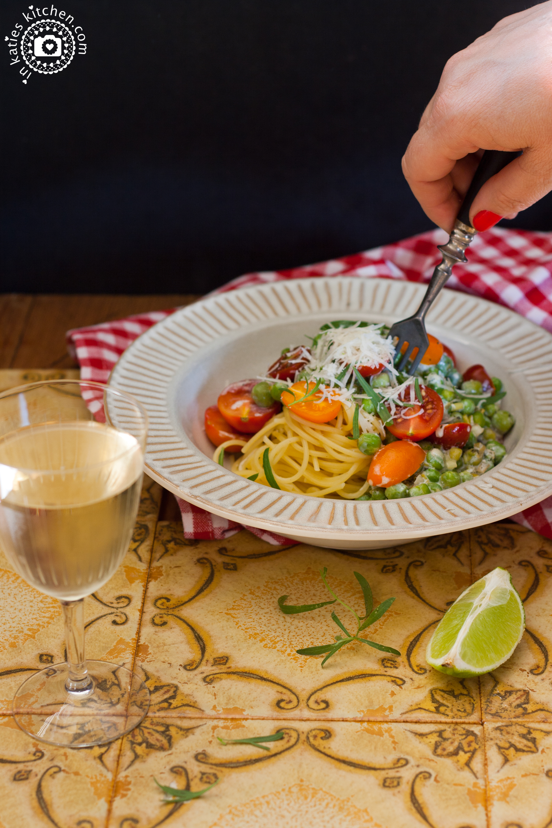 Einen ausreichend großen Topf mit Salzwasser aufkochen und die Spaghetti nach Packungsaufschrift zubereiten. In der Zwischenzeit das Olivenöl in einem Topf erhitzen und die zerdrückte Knoblauchzehe und die Zwiebelwürfel darin anschwitzen. Den Knoblauch entfernen und die Erbsen hinzufügen. Eine Kelle vom heißen Nudelwasser dazugeben und die Erbsen mit geschlossenem Deckel 2-3 Minuten gar kochen. Den Ricotta unterrühren und die Tomatenhälften unterheben. Etwas Limettenabrieb und die Estragonblättchen darüberstreuen. Nochmals kurz umrühren und die Pastasauce mit Salz, Pfeffer, einer Prise Zucker und etwas Limettensaft abschmecken.