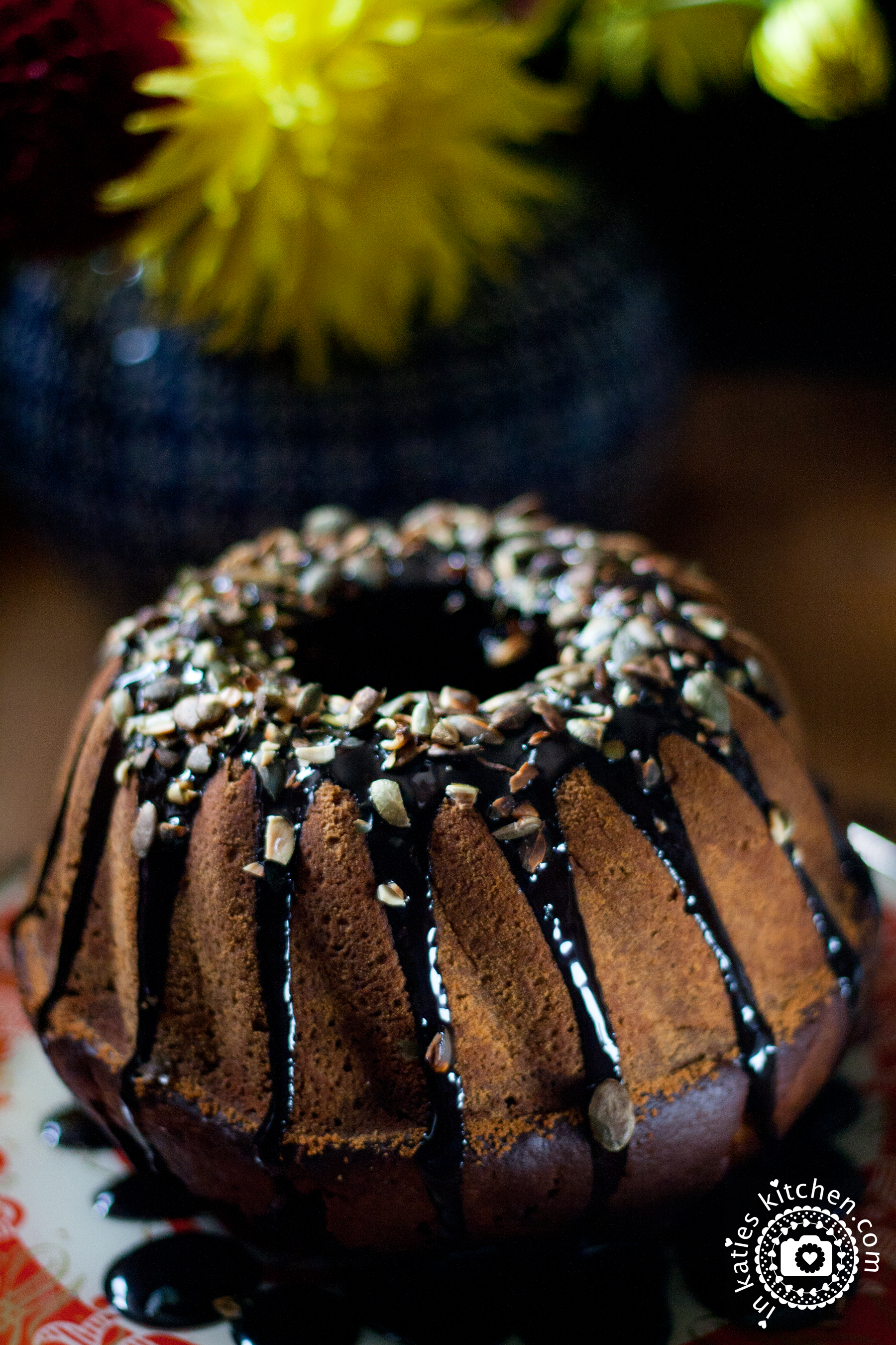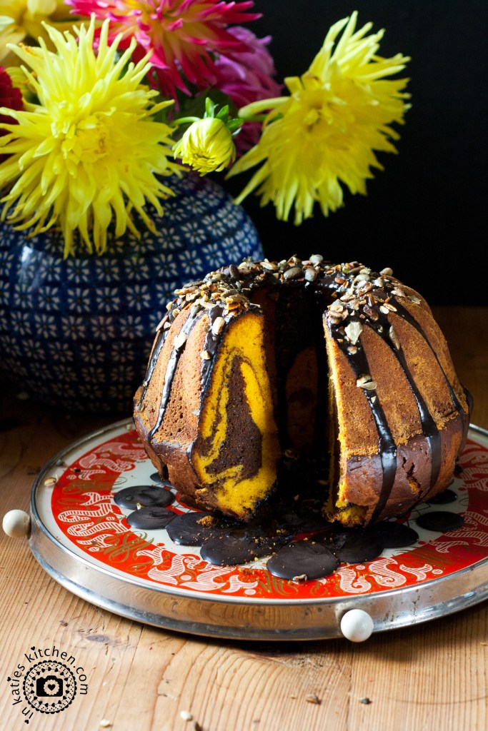 Wenn der Kuchen abgekühlt ist, kann er mit Schokoglasur und Kürbiskernen getoppt werden. Hierfür die Kuchenglasur nach Packungsanweisung im Wasserbad schmelzen und über den Kuchen gießen. Die angerösteten Kürbiskerne grob hacken und auf die Glasur streuen.